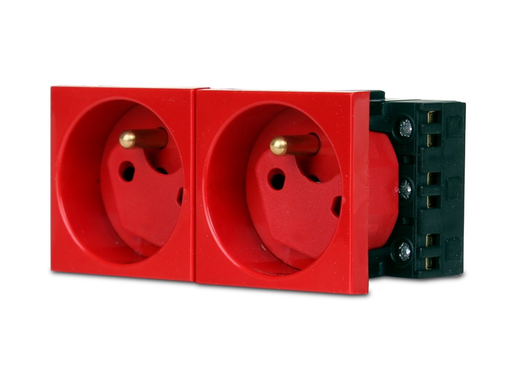 Dvojitá elektrická zásuvka určená k vytvoření oddělených napájecích instalací pro počítačové vybavení. Lze připojit pouze zástrčkou vybavenou klíčem s uvolňovacím zámkem. Plastové díly z PBT. Kontakty z měděného pásku M63. Modul 45x45 mm je vhodný pro montáž do nosných rámů, nástěnných a podlahových krabic, stolních výsuvných sloupů, kufrů a nástěnných vaniček vhodných pro montáž příslušenství v tomto standardu.