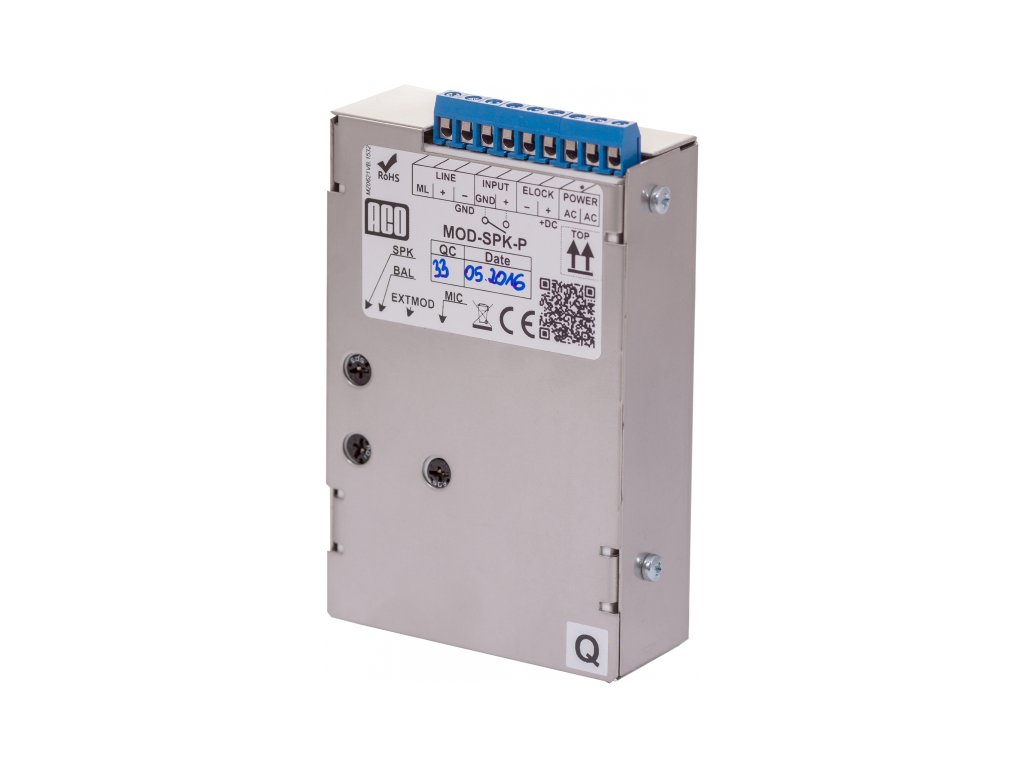 ACO MOD-SPK-P je volací modul speciálně navržený pro vestavbu. Pro plný provoz systému je nutný modul tlačítek přímé volby MOD-10NBP. Je také možné připojit kameru a pracovat s videointerkomovými systémy ACO (pak jsou nutné další video moduly).Modul má speciální vestavěné pouzdro z nerezové oceli s parametry panelů řady Familio P/PV.