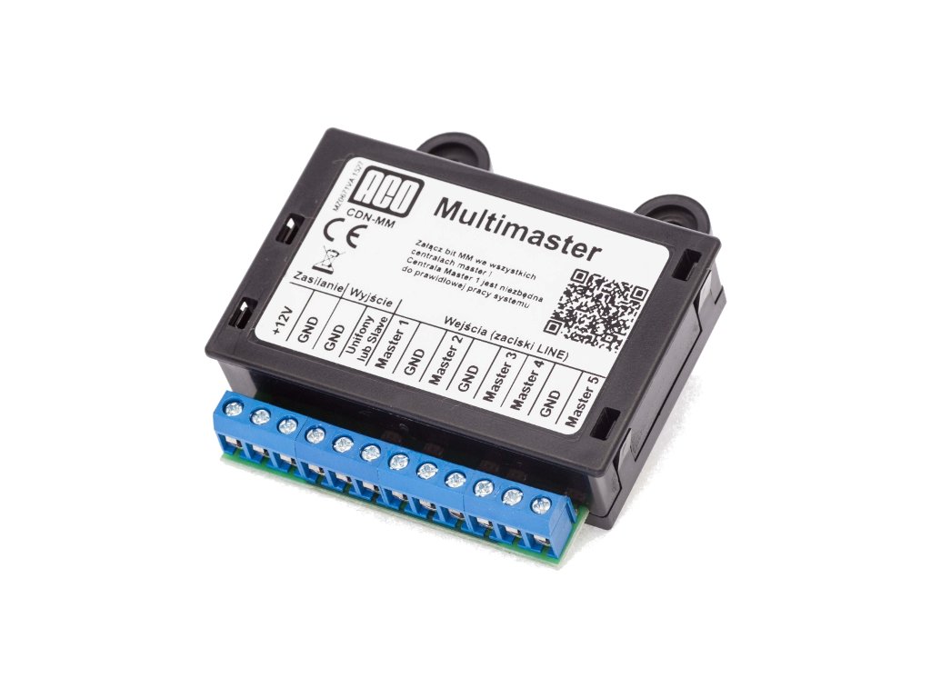 Modul Multimaster pro vstupní dveře ACO. Slouží k rozšíření sítě o nové hlavní ústředny. Umožňuje propojení mnoha hlavních interkomových panelů na jednom místě. Instalace typu hvězda.