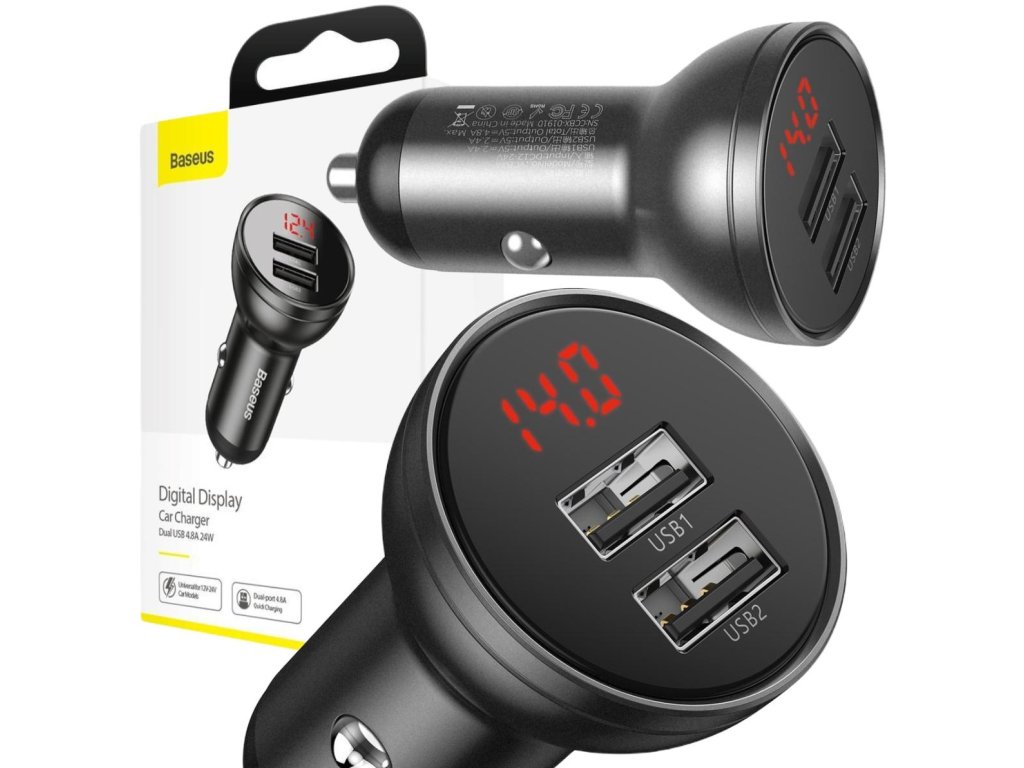- Nabíječka Digitální displej Baseus CCBX-0G 24W 4,8A 2x USB-A má chytrý displej která vás vždy informuje o tom, jak moc se vaše zařízení nabíjí. Inteligentní na displeji nabíječky do auta se také sleduje napětí baterie abyste ji mohli ovládat.