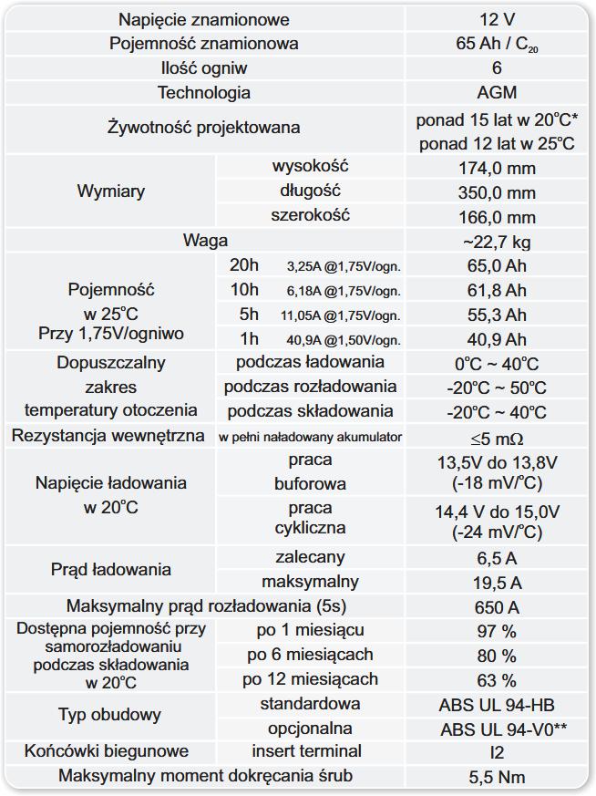 Baterie AGM EPL řady EPL 12V 65Ah (životnost 15 let) - TECHNICKÉ ÚDAJE: