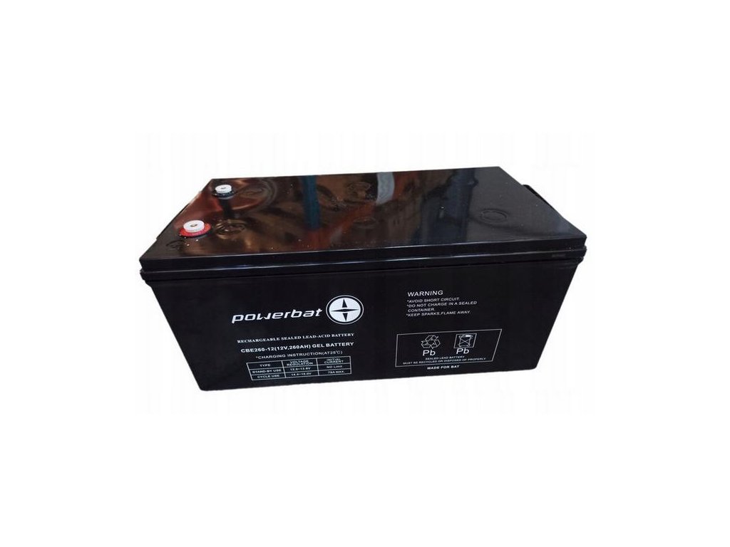 Baterie PowerBat CBE 260-12 vyrobeno z technologiíVRLA GEL. Jedná se o zcela uzavřenou baterii, kde je elektrolyt zachycen ve formě gelu.