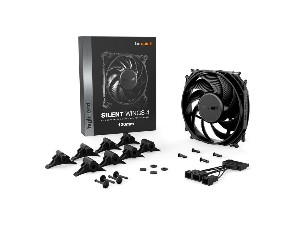 Silent Wings 4 120 mm je nejlepší volbou pro jakýkoli scénář použití ventilátoru. Ať už je namontován ve skříni, na radiátoru nebo v systému vodního chlazení, jeho vlastnosti, jako jsou lopatky optimalizované pro tichý provoz a trychtýřovitý rám ventilátoru, činí z ventilátoru Silent Wings 4 120 mm řešení, které neuznává kompromisy mezi prakticky tichým provozem a účinným chlazením.