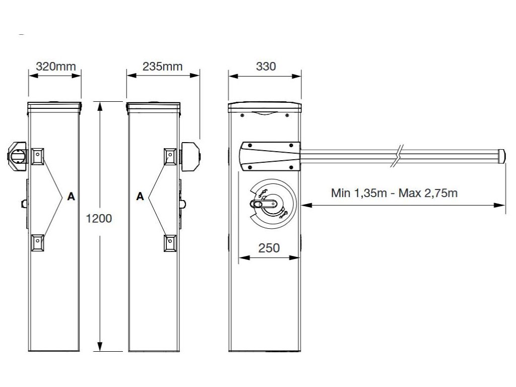 Vysokorychlostní silniční závora s délkou ramene 3 m (použitelný světelný průjezd 2,75 m). Umožňuje otevřít přejezd za méně než 1 sekundu! Její enormní životnost 5 milionů cyklů zajišťuje bezkartáčový motor a jednoduchost programování zajišťuje mimořádně intuitivní řídicí jednotka s vestavěným rádiem pro 512 kódů, která je umístěna hned pod horním krytem (výklopným!)