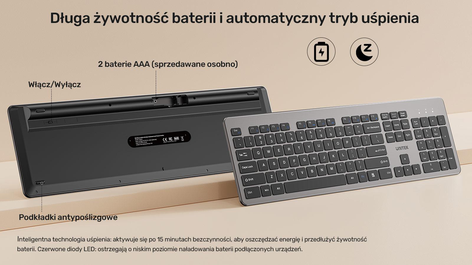 Bezdrátová myš se po 15 minutách nečinnosti automaticky přepne do režimu spánku, což výrazně prodlužuje životnost baterie. Klávesnice a počítač se probudí současně po stisknutí libovolné klávesy.