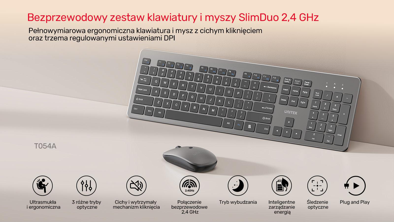 Unitek T054AGY01-US SlimDuo 2.4G je praktická sada bezdrátové klávesnice a myši, která se bude hodit na každé počítačové stanici. Štíhlý design, ergonomie a stabilní 2,4GHz připojení s dosahem až 10 metrů zajistí pohodlnou práci doma i v kanceláři bez nutnosti instalace dalších ovladačů.