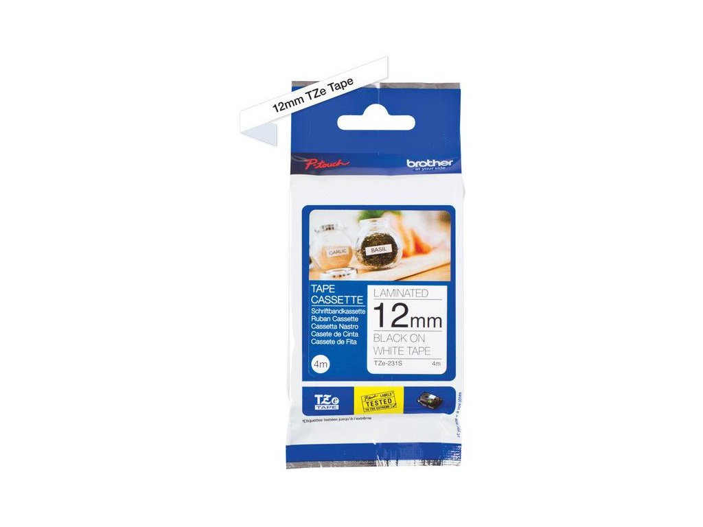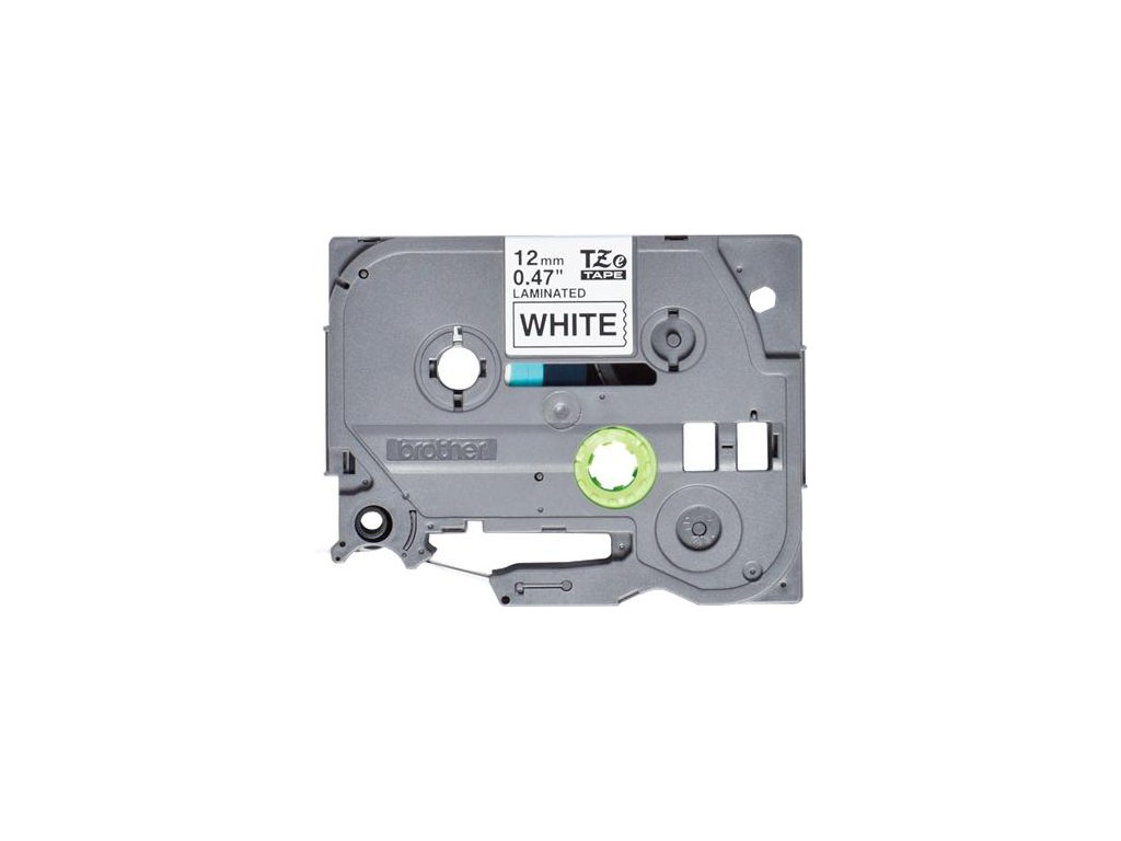 Laminovaná páska o šířce 12 mm a délce 4 m, s bílým pozadím a černým potiskem. Vhodná pro vybraná zařízení Brother.