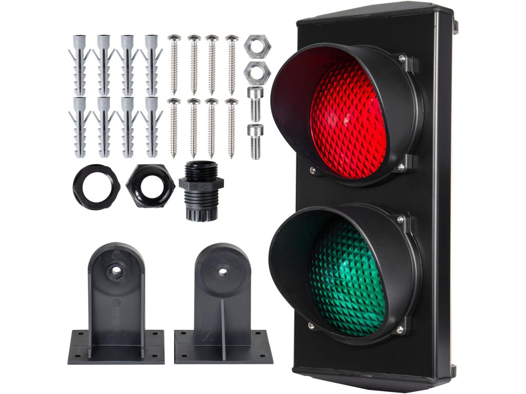 Semafor s dvoubarevným světelným systémem (červený a zelený), připravený k montáži na stěnu, vybavený 2 montážními držáky a kabelovou vývodkou. Kryt z lakovaného hliníku a vysoce odolného ABS. Ideální pro kontrolu přístupu, instalaci na automatické brány nebo závory.
