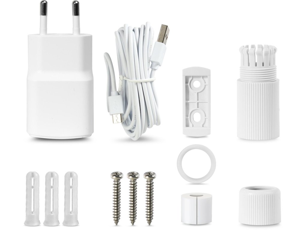 - Obsah balení kamery: montážní příslušenství, návod k použití, napájecí kabel, zařízení