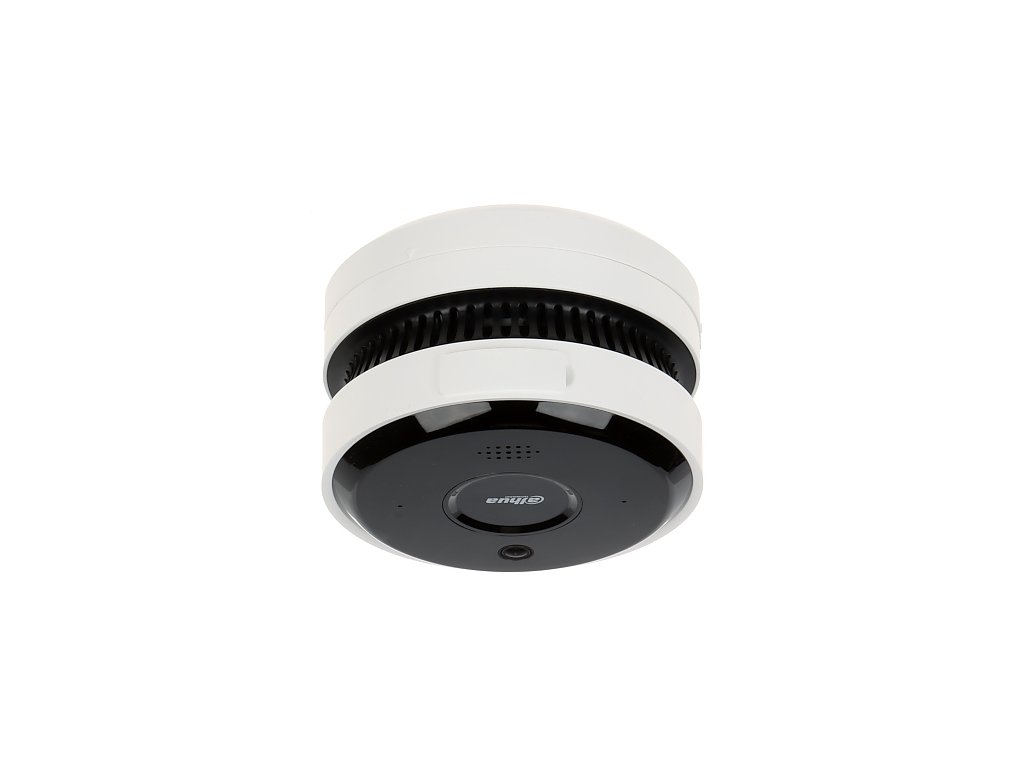 IP kamera s detektorem kouře; modul detektoru kouře: fotoelektrický senzor, ochranná plocha 30m2-60m2, signalizace alarmu pomocí zvuku a LED, napájení 12V/PoE, lithiová baterie 3V; modul kamery: senzor 1/2.7" CMOS 2592 (H) × 1944 (V), objektiv 2 mm F2.0, max. 2592 × 1944 (1 fps-20 fps), BLC, HLC, WDR (90 dB), IR přísvit max. 20 m, detekce plamene, DC12V+PoE, rozměry Φ120 mm × 79 mm, provozní teplota -10°C až +55°C