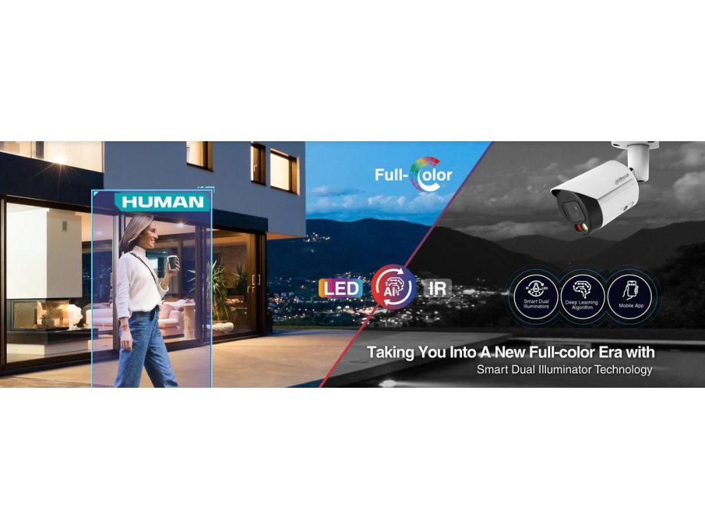 Inteligentní technologie duálního osvětlení Společnost Dahua používá inteligentní algoritmy pro dynamické řízení osvětlení. Ve výchozím nastavení je v noci aktivní infračervené osvětlení, a když je ve sledované oblasti detekován cíl, zapne se bílé světlo, což umožňuje plnobarevné nahrávání událostí. Jakmile cíl opustí oblast, kamera se automaticky přepne zpět na infračervené osvětlení, což účinně snižuje světelné znečištění.