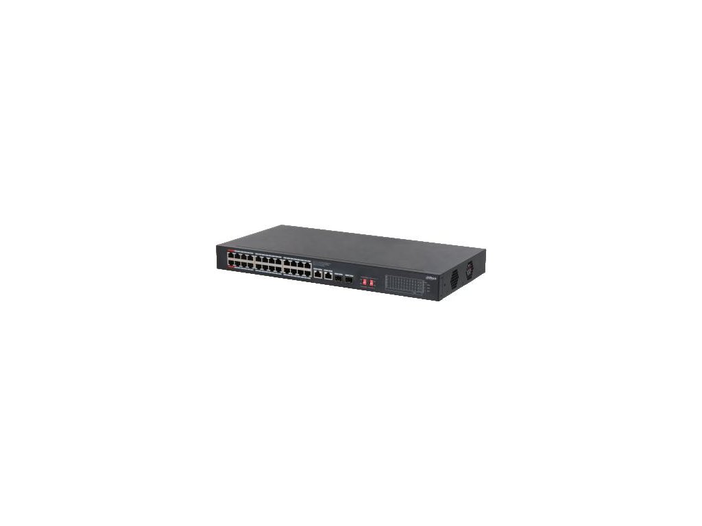 | Popis funkčních zásuvek | Porty 1-24: 24 × RJ-45 10/100/1000 Mb/s (PoE); Porty 25-26: 2 × RJ-45 10/100/1000 Mb/s (Uplink); Porty 27-28: 2 × SFP 1000 Mbps (Uplink) |