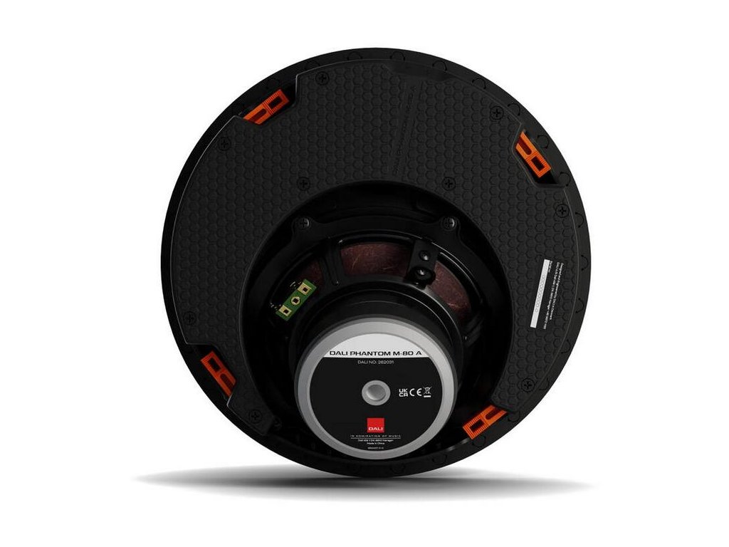 Sedmipalcový woofer M-80 A s lehkou membránou z papíru a dřevěných vláken, nízkoztrátovým pryžovým obalem a patentovaným magnetickým systémem DALI založeným na SMC nabízí bohaté, plné nízké frekvence a přirozené, nezabarvené střední pásmo. V kombinaci s novým nadrozměrným 28mm měkkým kopulovitým výškovým reproduktorem s působivě rozšířenými a detailními horními frekvencemi je výsledkem reproduktor, který nabízí špičkovou kvalitu zvuku v kategorii stropních reproduktorů.