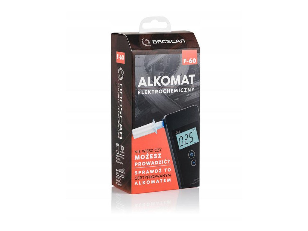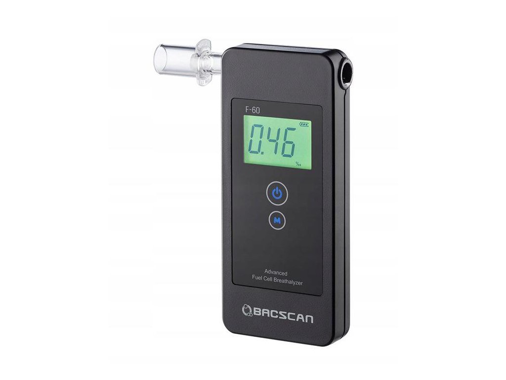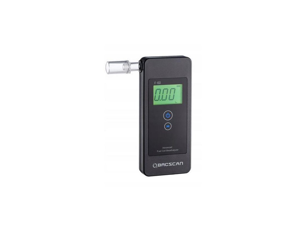 - BACscan®  F60 má široký rozsah měření 0,00 až 5,00 ‰. Výsledky měření se zobrazují s rozlišením až do dvě desetinná místa . Osvětlený držák náustku a jasný, snadno čitelný displej lCD displej usnadňují měření pomocí nízká hladina osvětlení . Užitečným řešením je signalizace poplachu která se aktivuje při překročení povolené koncentrace alkoholu 0,20 ‰.