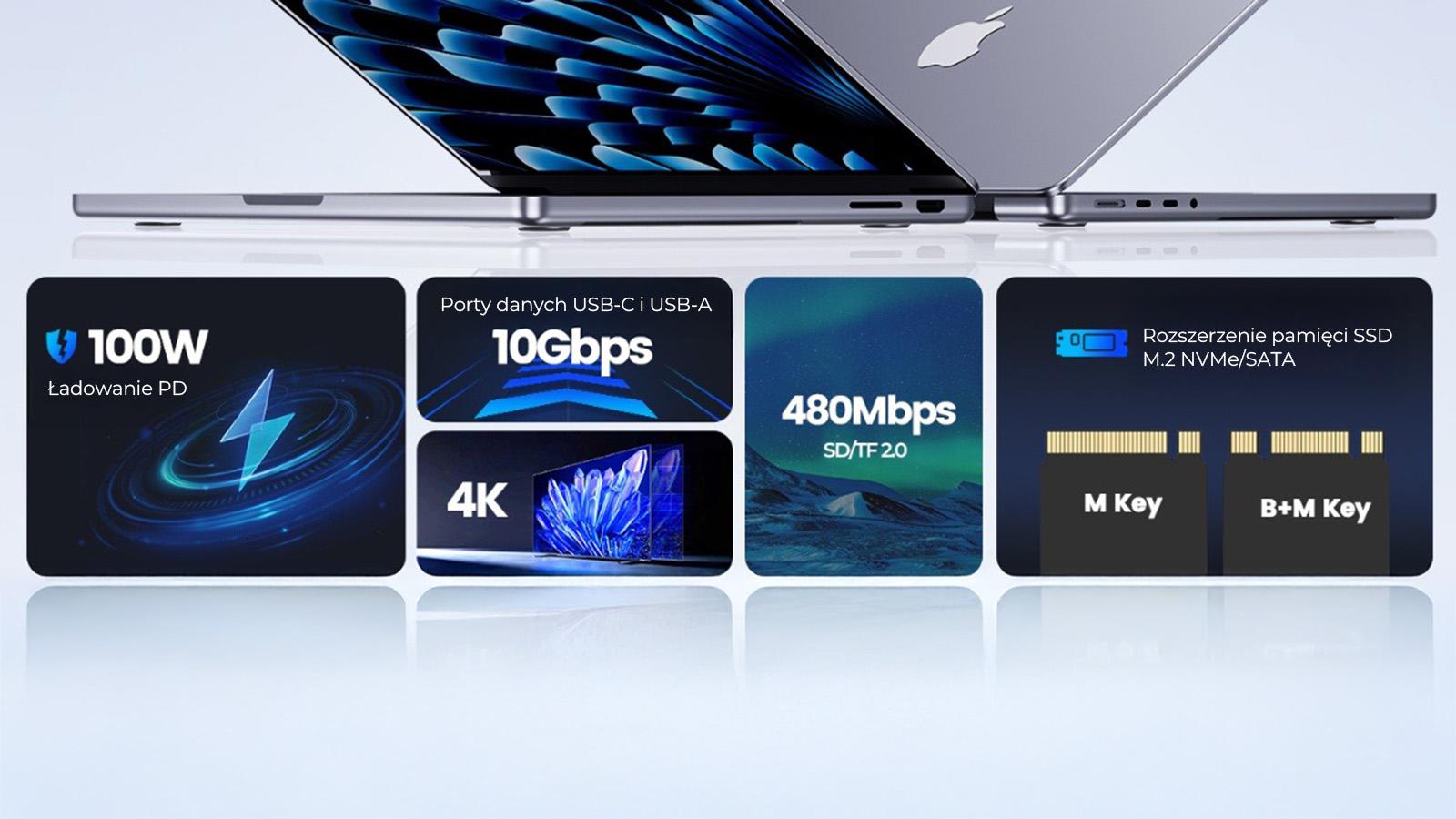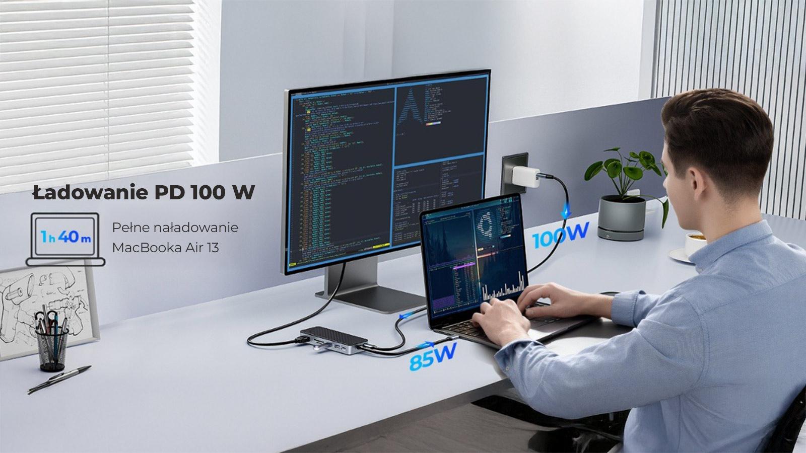 Port USB-C PD poskytuje výkon až 100 W, takže můžete napájet notebook nebo MacBook přímo přes rozbočovač a zároveň používat další zařízení. Stačí ke stanici připojit vhodně výkonnou nabíječku USB-C.