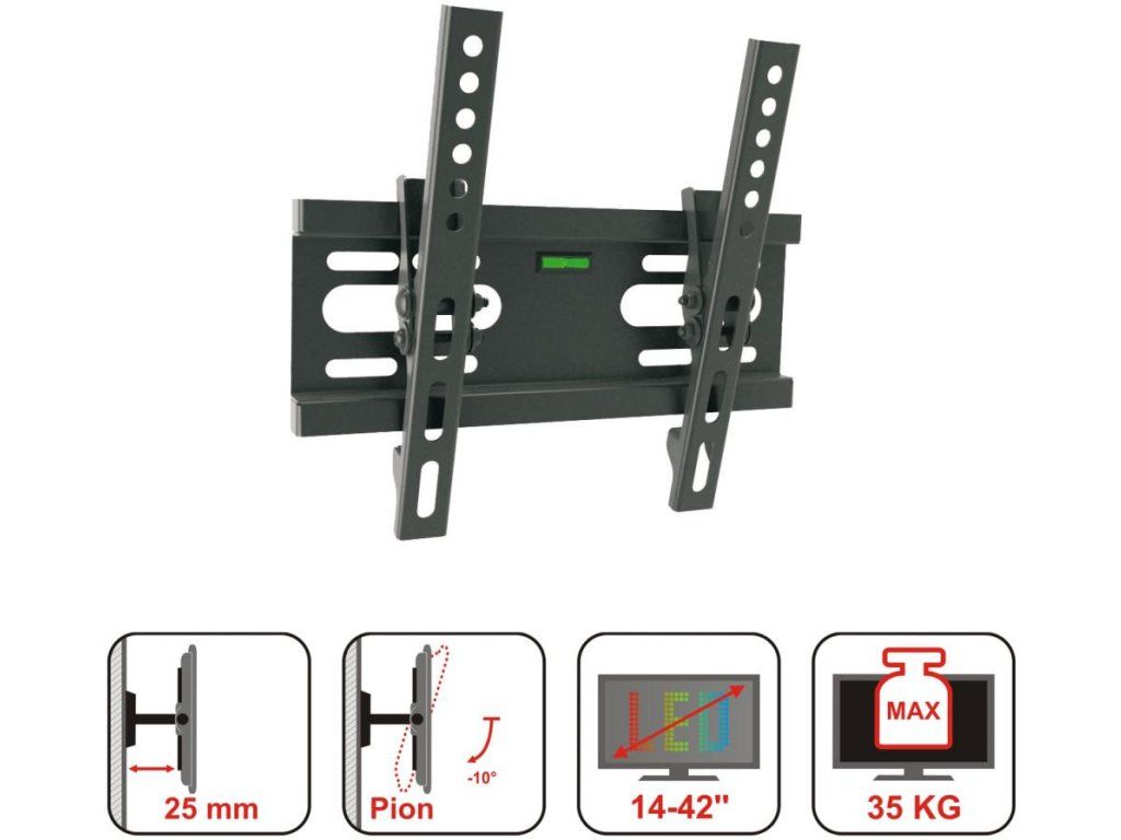 ART AR-46 je pevný nástěnný držák určený pro montáž televizorů a monitorů s úhlopříčkou 14 až 42 palců. Díky robustní kovové konstrukci poskytuje stabilní a bezpečné upevnění zařízení i při maximálním zatížení 35 kg.