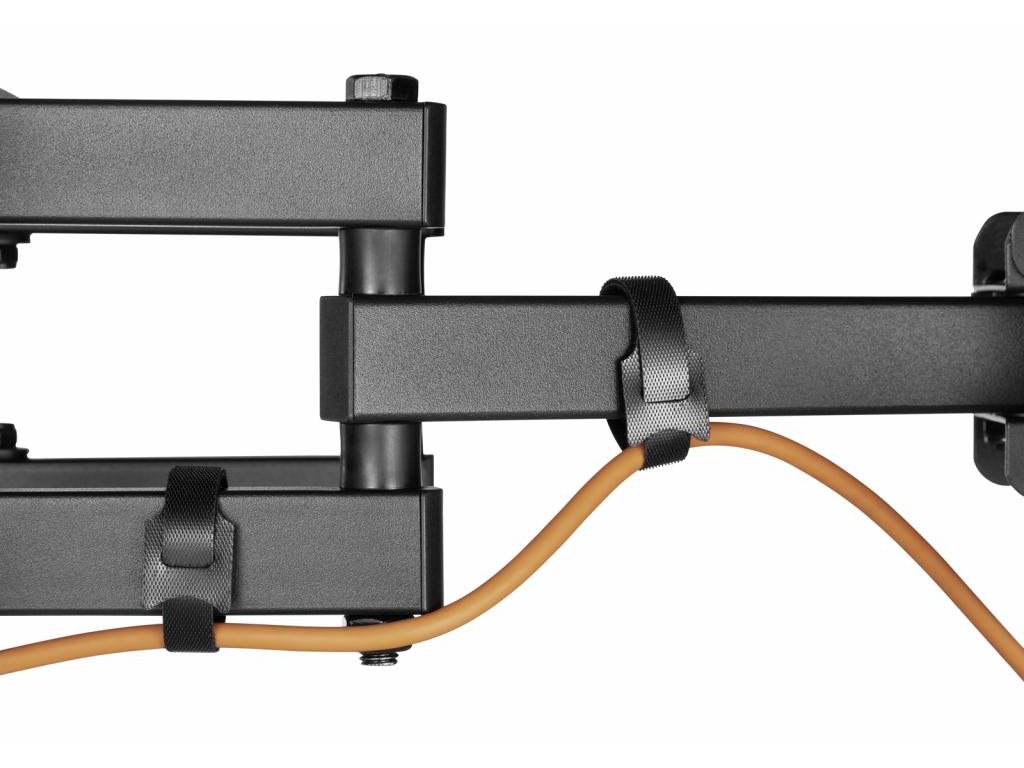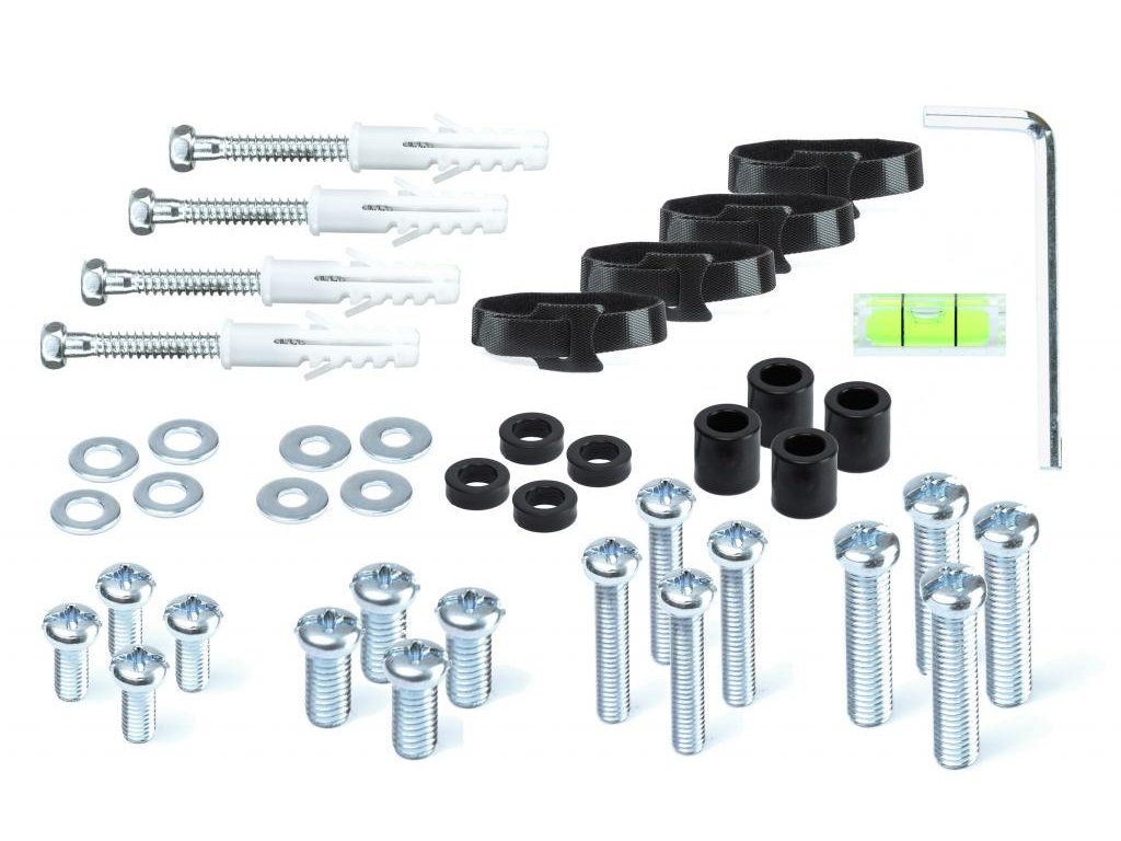 Součástí balení jsou potřebné šrouby pro montáž a vodováha, které usnadňují správné a přesné zavěšení televizoru. Držák má robustní konstrukci a 8bodové bezpečné uchycení, které zaručuje bezpečné a stabilní upevnění televizoru.