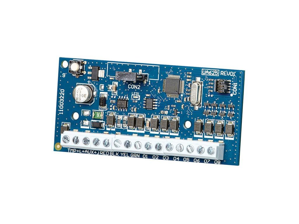 Modul HSM2208 je pevně připojený modul 8 nízkoproudých výstupů PGM (až 50 mA na výstup) určený pro ústředny DSC Neo (HS2016, HS2032, HS2064, HS2128) navíc vybaven výstupem AUX (až 250 mA) a vstupem pro sabotáž.