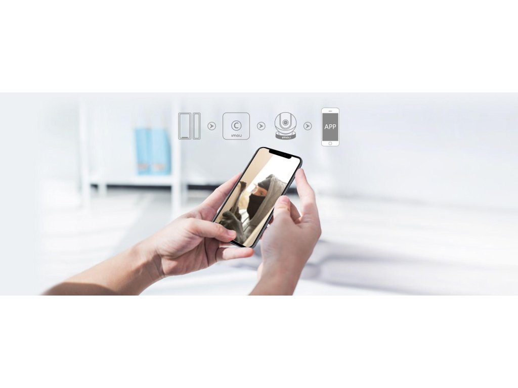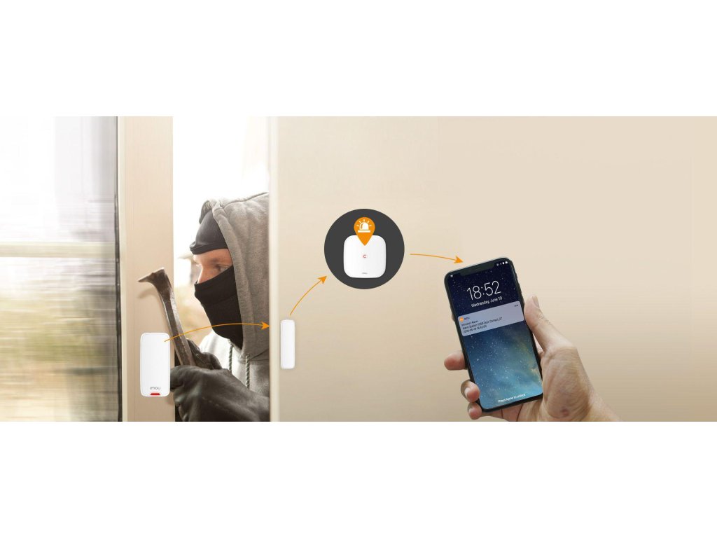 Když někdo otevře dveře, kontaktní senzor na dveřích se rozpojí a infračervený pohybový senzor IMOU v rohu může také detekovat pohyb. Tato dvě zařízení spustí alarm v ústředně a aplikaci, když je bezpečnostní systém zapnutý, takže víte, co se doma děje v reálném čase.