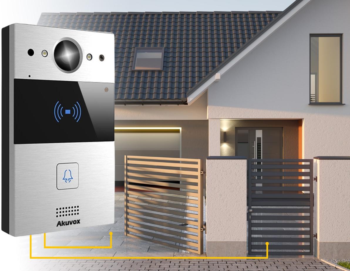 - Akuvox R20AV5 má 2 výstupní relée, které umožňují dálkové otevírání dveří nebo vrat. Jedná se o ideální řešení pro řízení přístupu do budovy nebo na pozemek.