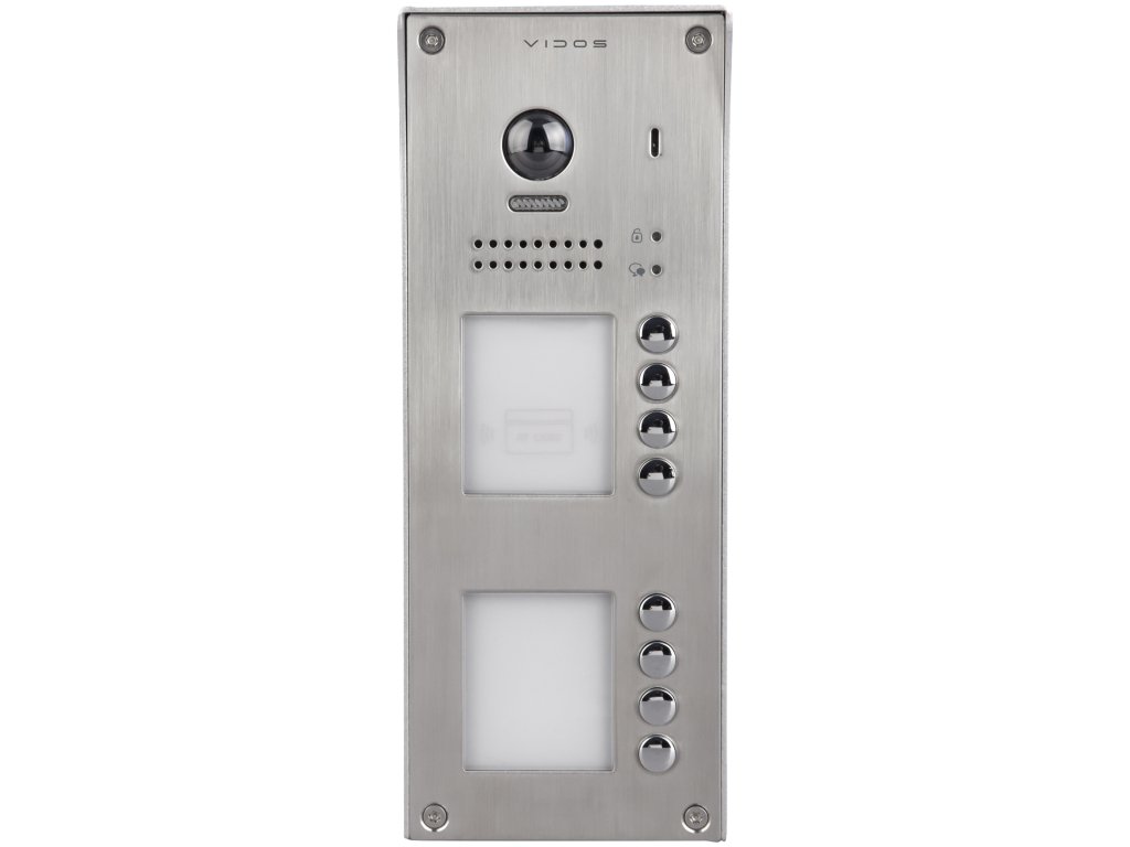 Dveřní stanice s osmi subdodavateli a vestavěnou bezkontaktní čtečkou pro otevírání vchodu kartou nebo klíčenkou.