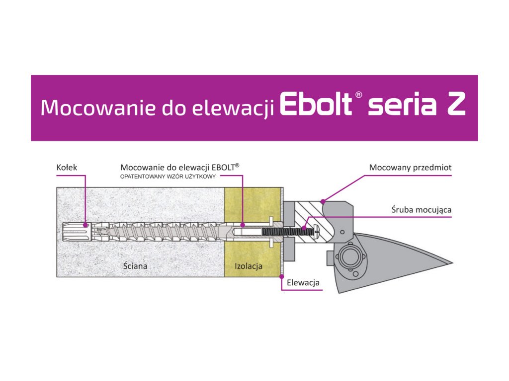 Šroub s vnitřním závitem umožňuje montáž těžkých předmětů na fasádu budov zateplených pěnovým polystyrenem (např. kamery, svítidla atd.). Při montáži nedojde k rozdrcení fasádní izolace a není třeba vrtat montážní otvory do přiložených výrobků. Největšími výhodami systému Ebolt jsou:
