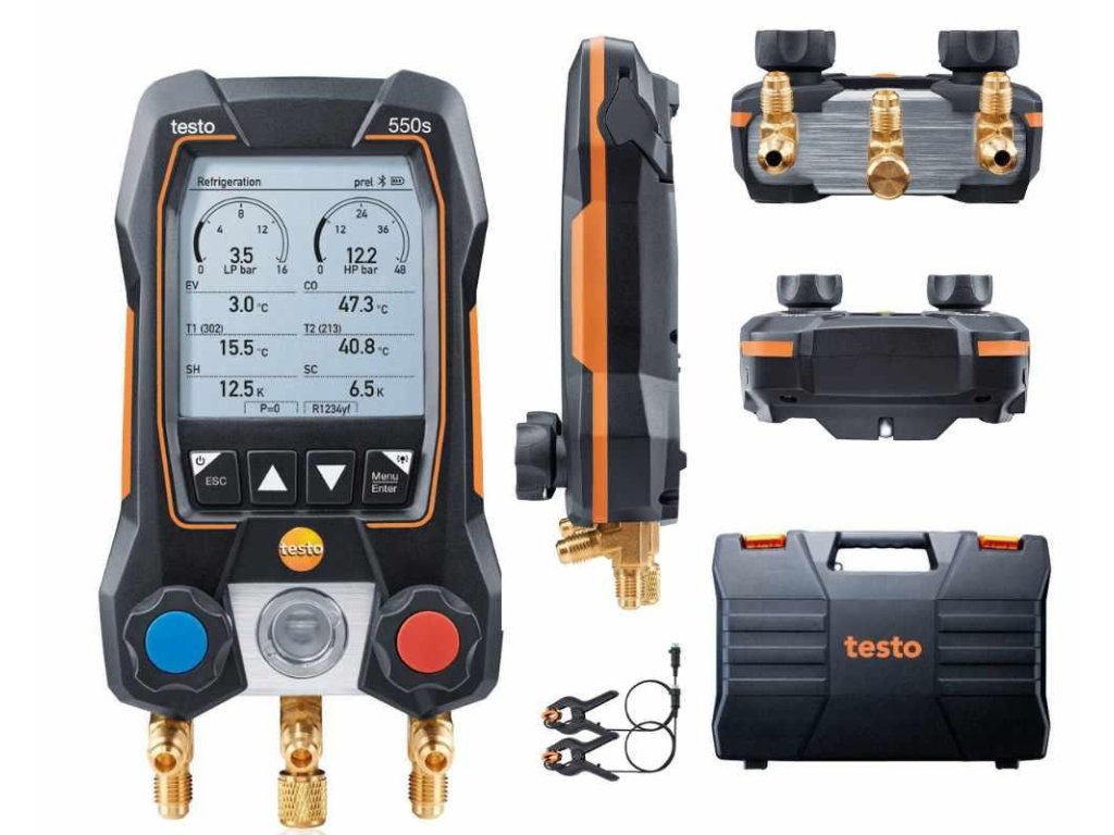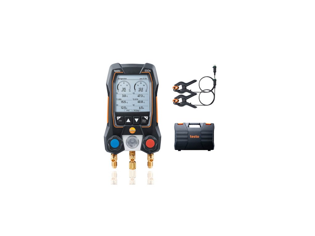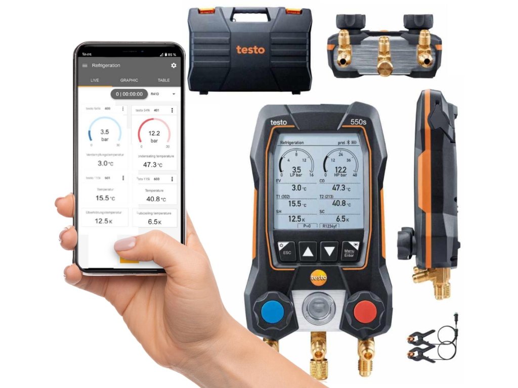 S touto sadou budete připraveni okamžitě začít měřit při uvádění do provozu, servisu a údržbě chladicích a klimatizačních zařízení a tepelných čerpadel: obdržíte elektronický držák ventilů testo 550s Bluetooth s dvoucestnou ventilovou baterií, dvě teplotní sondy na kabelu (NTC) a robustní kufřík. Další sondy Bluetooth, např. pro bezdrátové měření podtlaku s testo 552i (nutno objednat zvlášť).