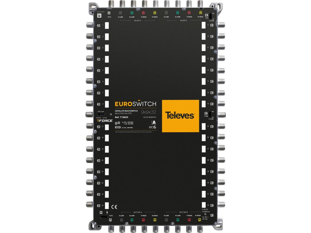 Kompaktní multipřepínač s 9 vstupy (1 pozemní vstup a 8 vstupů pro dva satelity, každý se čtyřmi polarizacemi) a 32 uživatelskými výstupy.