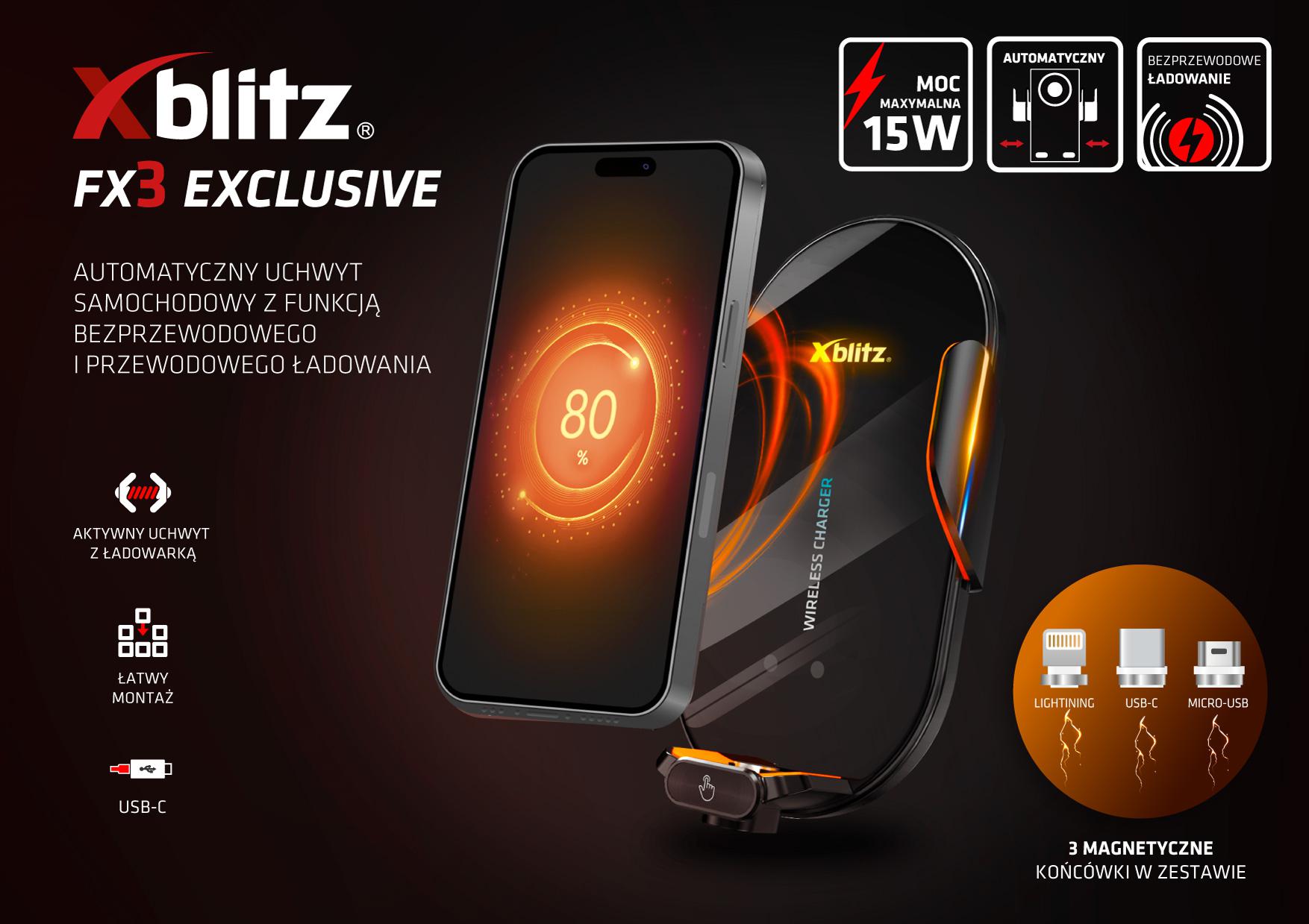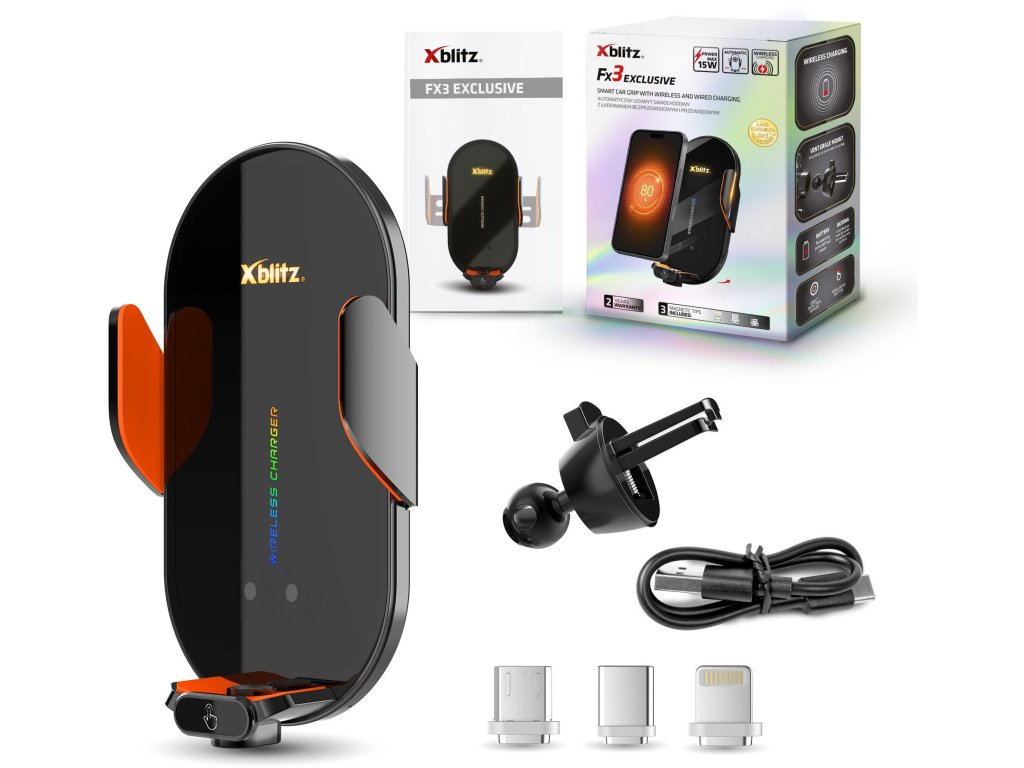 Xblitz FX3 Exclusive podporuje bezdrátové i kabelové nabíjení, takže můžete přizpůsobit způsob napájení svému telefonu. Bezdrátové nabíjení se spustí automaticky po vložení smartphonu do držáku. Pro zařízení, která nepodporují bezdrátové nabíjení, je k dispozici možnost kabelového nabíjení prostřednictvím 3 magnetických koncovek, které jsou součástí sady.
