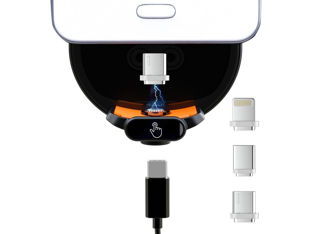Součástí balení jsou tři magnetické svorky: USB-C, Lightning a Micro-USB, které zajišťují kompatibilitu s většinou modelů telefonů na trhu. Zasouvají se přímo do portu telefonu, což zajišťuje rychlé připojení k držáku. Díky tomu máte možnost kabelového nabíjení.