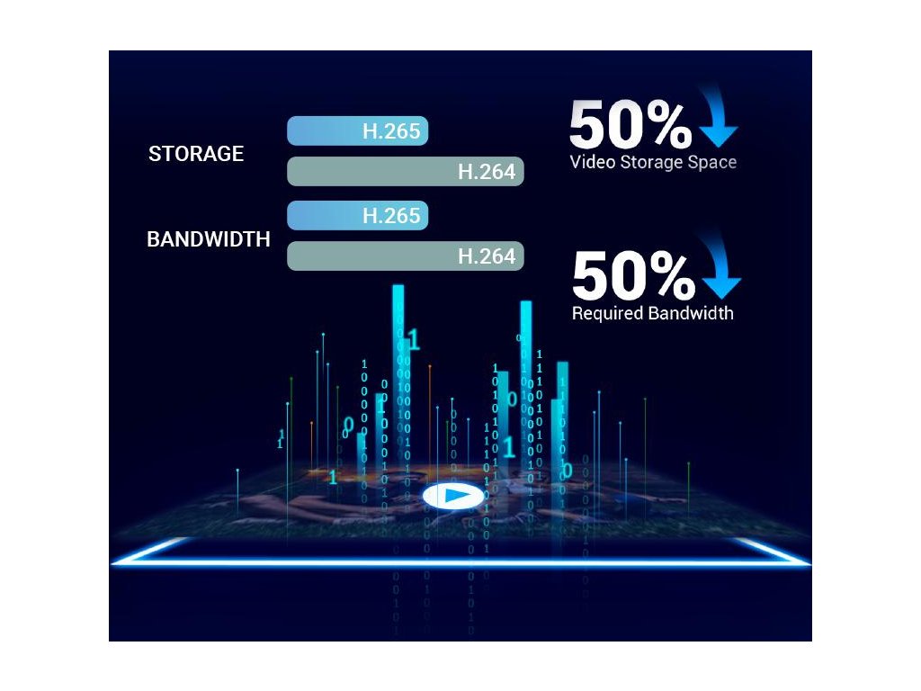 Technologie H.265 nabízí ve srovnání se standardem H.264 lepší plynulost přehrávání videí zaznamenaných v rozlišení 2K. Navíc se nemusíte obávat o místo na disku, protože technologie H.265 snižuje velikost video souborů až o 50 %, což usnadňuje ukládání obsahu.
