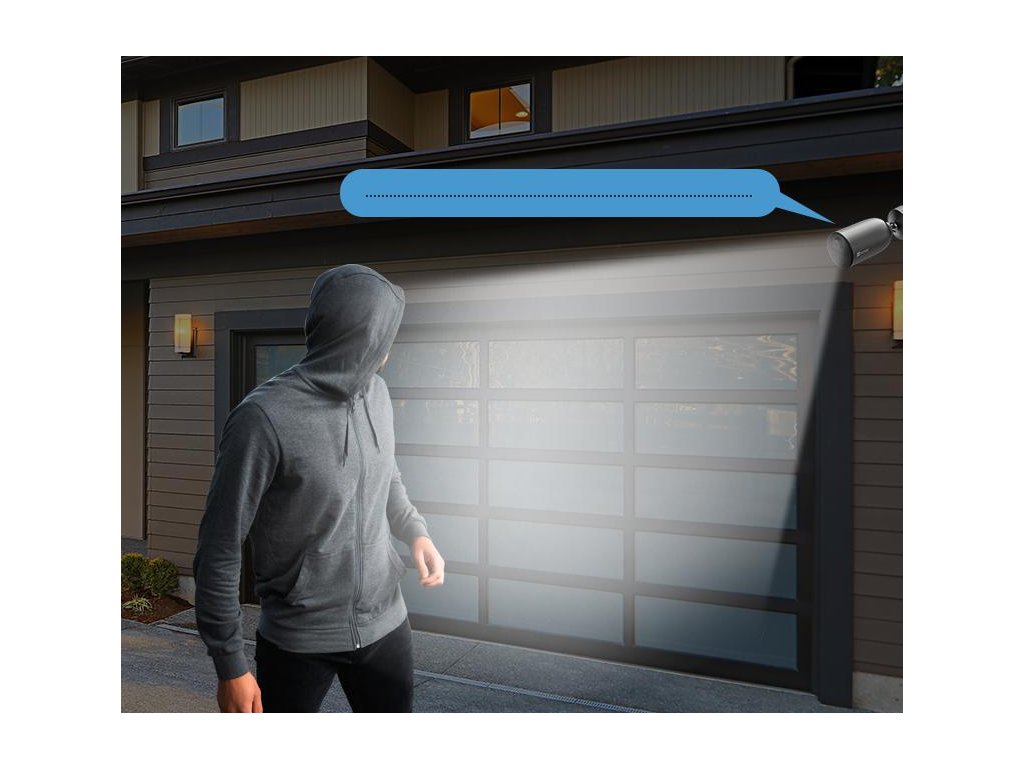 Kamera je vybavena aktivní bezpečnostní funkcí, která poskytuje další úroveň zabezpečení. V případě detekce narušitele kamera aktivuje hlasitou sirénu a dvě intenzivní světla⁵ a informuje nezvané hosty, že byli spatřeni.