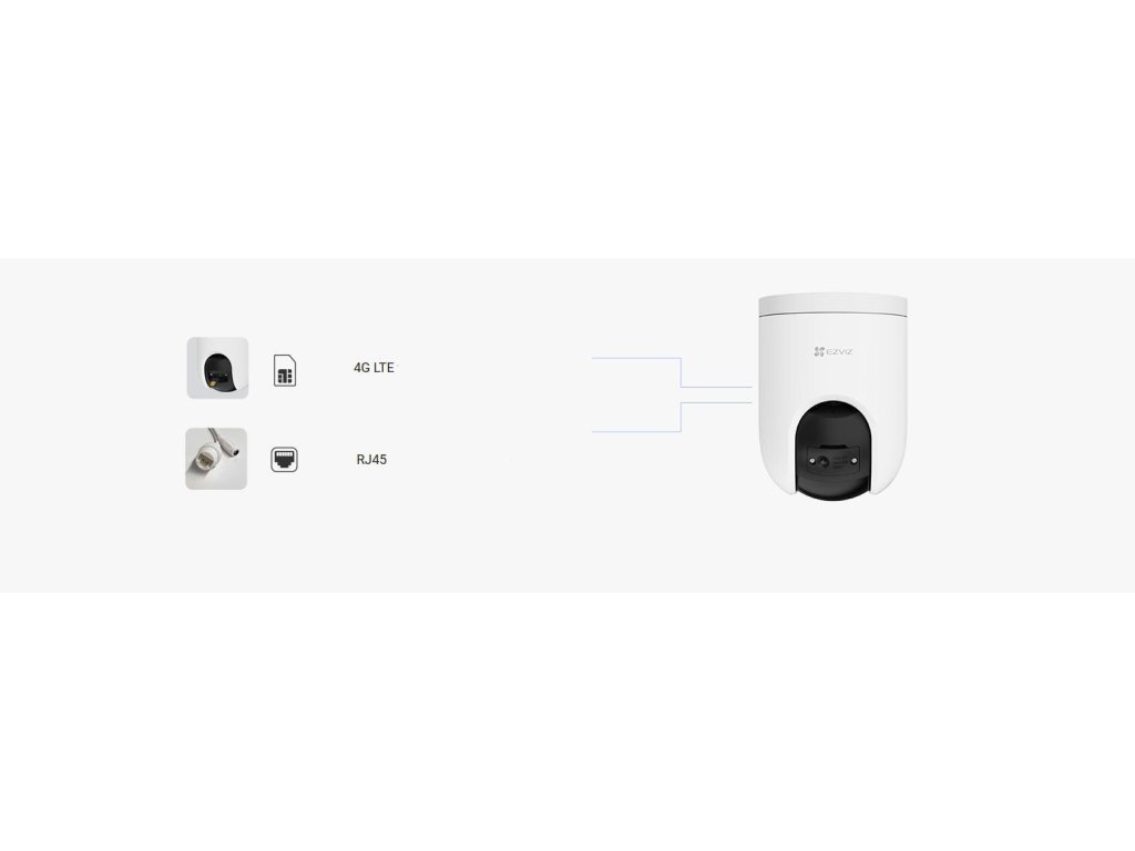 - Dvě možnosti připojení: uživatelé sledovací kamery EZVIZ CS-H8c máte na výběr ze dvou možností připojení k síti - ethernetový kabel RJ45 nebo karta nano SIM 4G . To usnadňuje nastavení kamery bez ohledu na konkrétní místo instalace a zajišťuje nepřetržitou konektivitu.