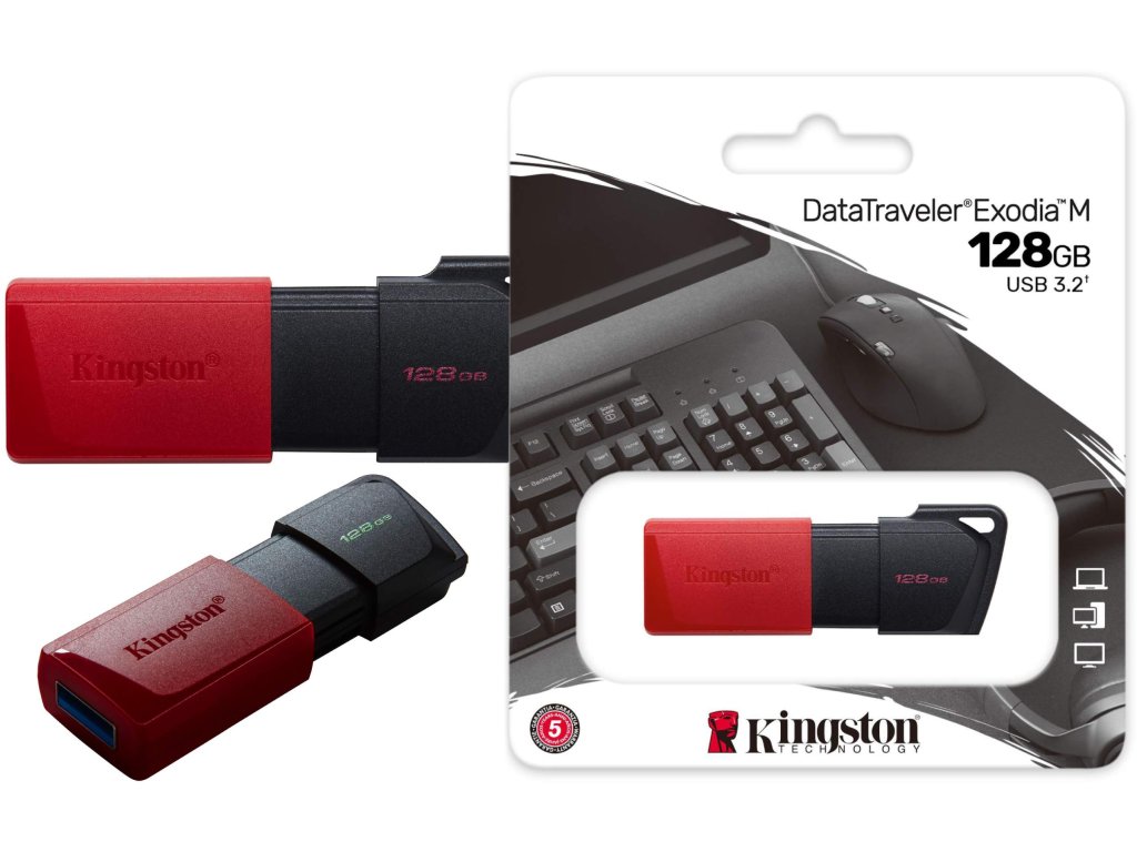 - Kingston DataTraveler® Exodia™ M je paměťová karta, která nabízí výkon rozhraní USB 3.2 Gen 1 a poskytuje uživateli snadný přístup k datům v noteboocích a stolních počítačích, monitorech a dalších elektronických zařízeních.