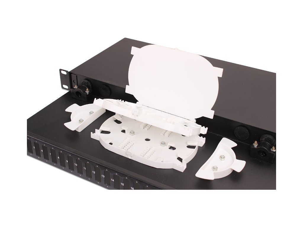 Optický přepínač 19" 24x SC Duplex 1U se čtyřmi vývodkami PG 13,5 v balení. Rozvaděč má 24 portů pro optické adaptéry a umožňuje zakončení až 48 optických vláken. Optický rozváděč je zařízení, které umožňuje přepínání optických vláken, propojení staničních a linkových kabelů a připojení měřicích zařízení, která jsou namontována na obou koncích optického telekomunikačního vedení.