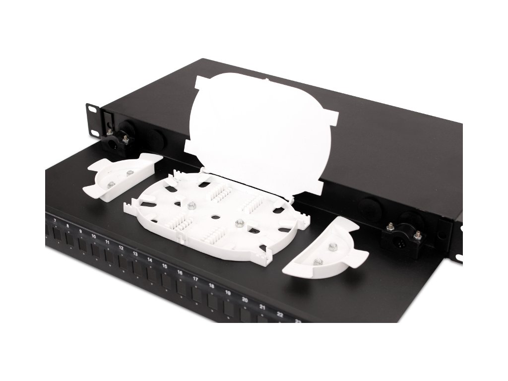 Optický přepínač 19" 24x SC Simplex 1U se čtyřmi vývodkami PG 13,5 v balení. Přepínač má 24 portů pro optické adaptéry a umožňuje ukončit až 24 optických vláken. Optický rozváděč je zařízení, které umožňuje přepínání optických vláken, propojení staničních a linkových kabelů a připojení měřicích zařízení, která jsou namontována na obou koncích optického telekomunikačního vedení.