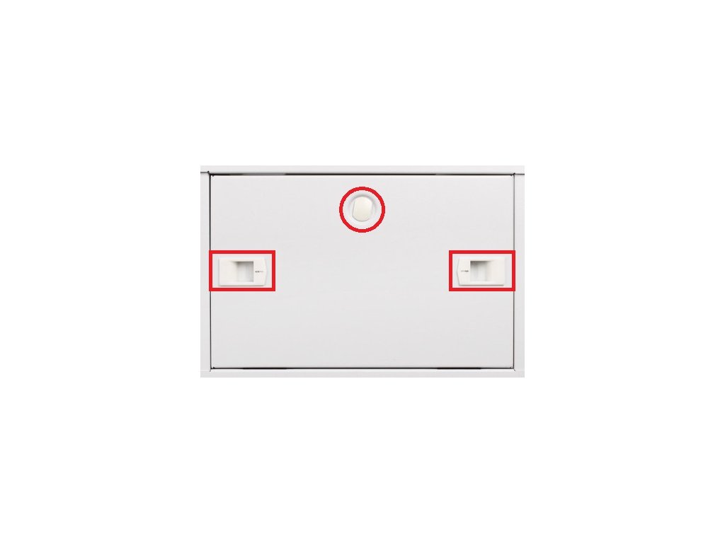 Přední dveře vybavené klikou se zámkem a větracími otvory.
