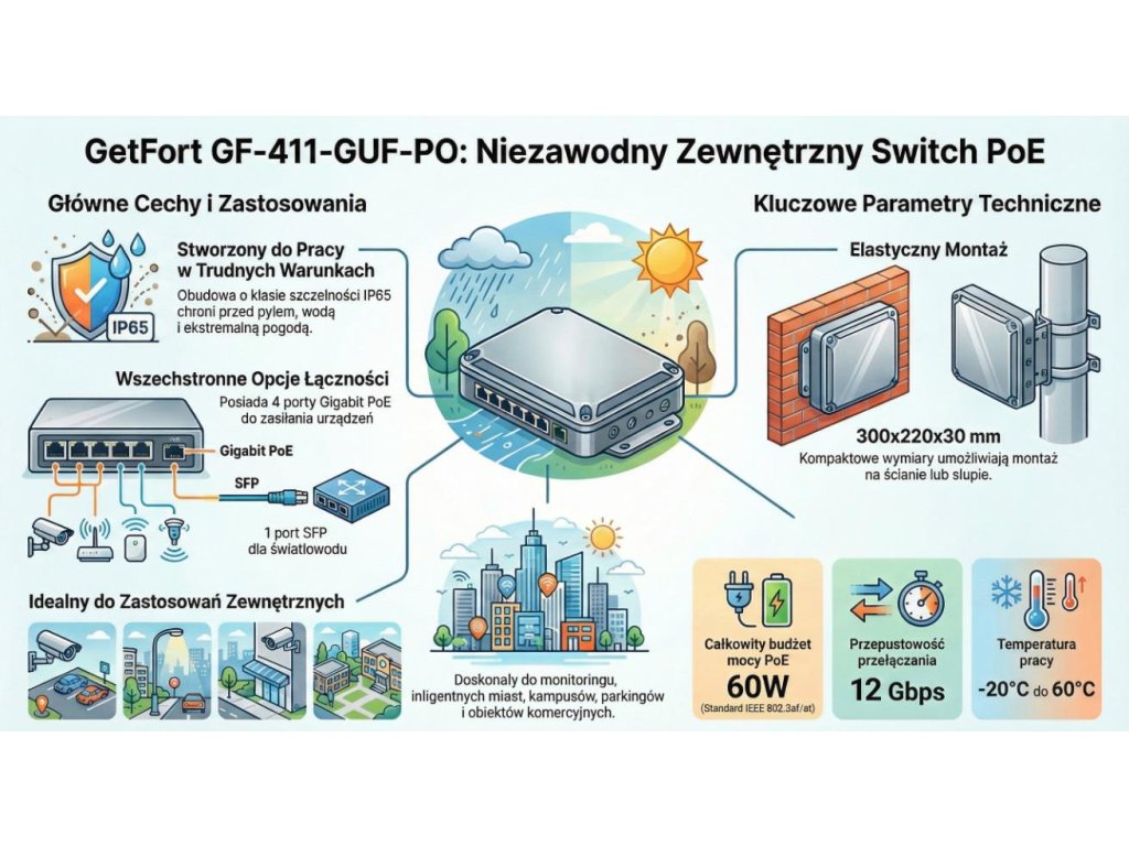 Toto řešení je nejen pohodlné, ale také zvyšuje flexibilitu při plánování sítě. Umožňuje instalovat zařízení na těžko přístupných místech, kde není k dispozici elektrické napájení. Kombinace funkcí PoE s dalšími pokročilými technologiemi společnosti GetFort z něj činí ideální volbu pro pokročilé síťové projekty.