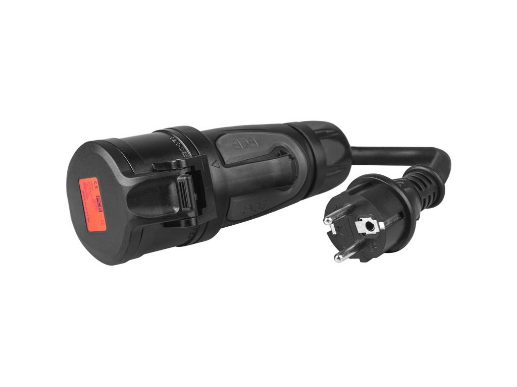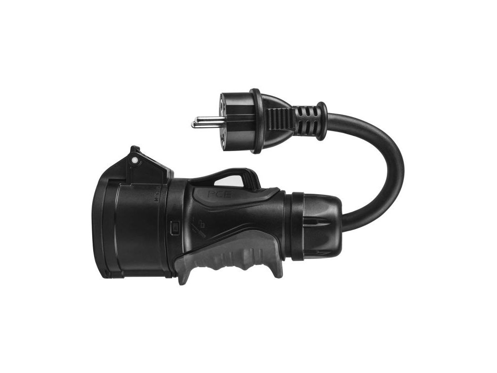 Adaptér z červené zástrčky CEE 16 A na zástrčku Schuko pro napájení přenosné nabíječky elektromobilu z jakékoli zásuvky v celé Evropě.