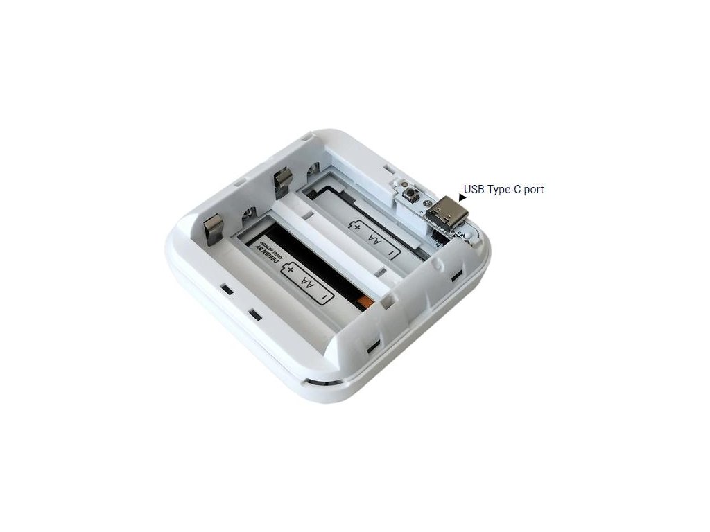 - Lze napájet z baterie (4xAA, není součástí dodávky) nebo přes USB-C (nepřetržité napájení)
