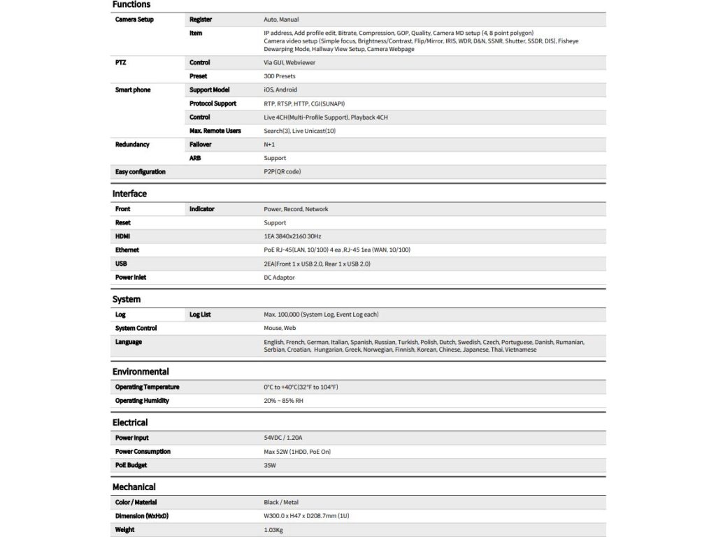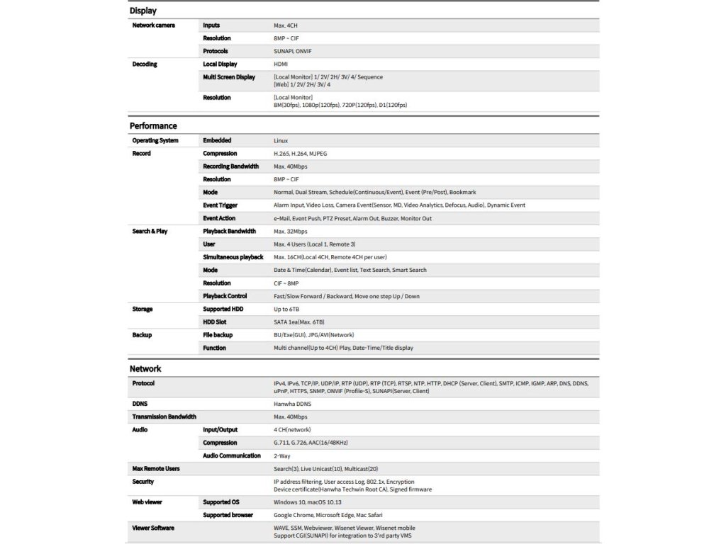 Spravujte až čtyři kamery pomocí čtyřkanálového 8 MP videorekordéru ARN-410S od společnosti Hanwha Techwin. Podporuje až 8 MP IP kamery a volitelný pevný disk SATA s kapacitou až 6 TB. Videokodeky H.265, H.264 a MJPEG umožňují správu velikosti souborů při zachování optimální kvality. NVR podporuje také obousměrný přenos zvuku. Port HDMI umožňuje přenášet video na externí monitor. Kompatibilita s profilem ONVIF S umožňuje spolupráci s IP kamerami ONVIF.