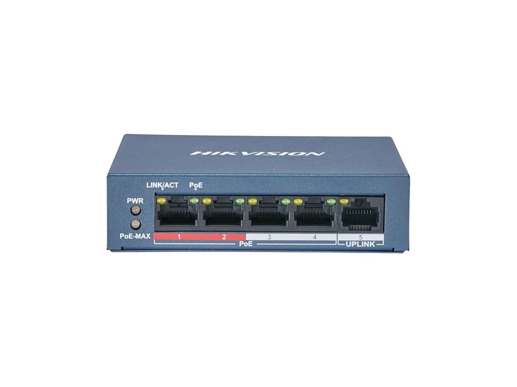 DS-3E0105P-E/M(B) Hikvision je přepínač pro budování malých IP dohledových systémů. Má 5 portů Fast Ethernet, z nichž 4 mohou poskytovat napájení PoE (802.3af/at) IP kamerám, z nichž první dva porty mají vysokou prioritu.