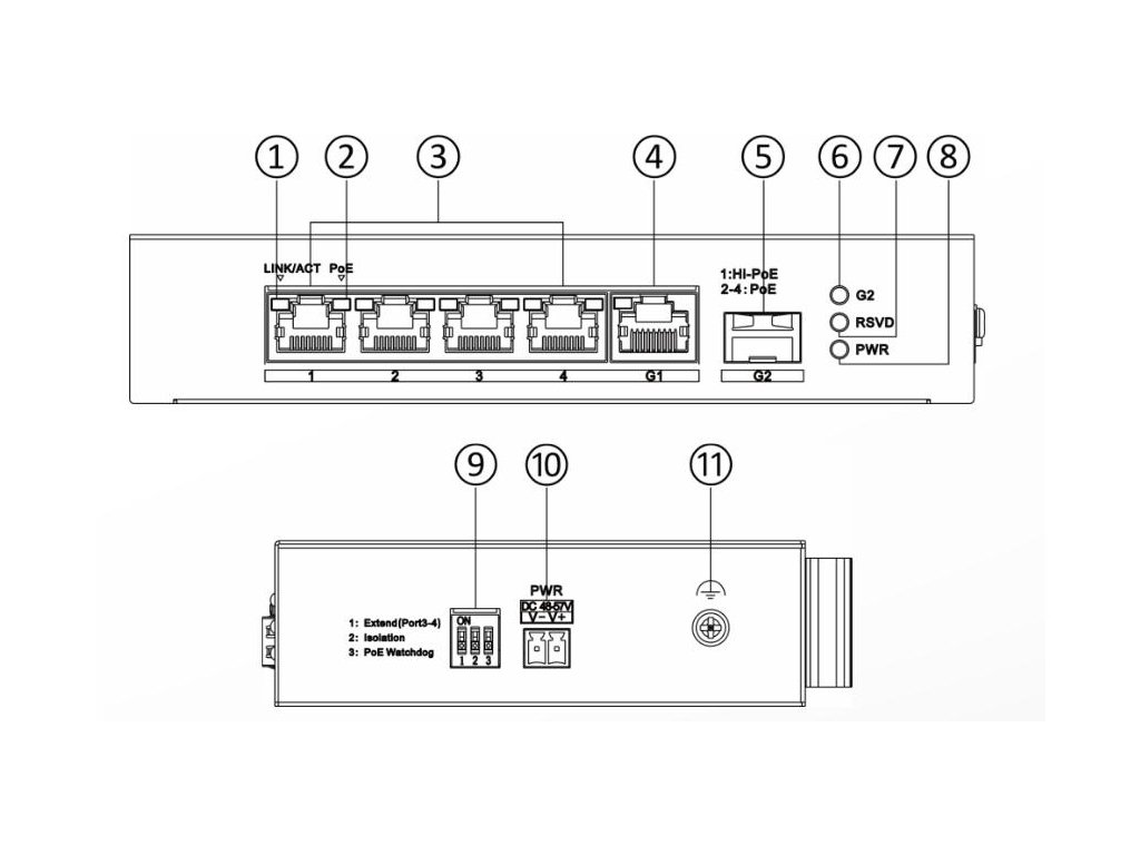 | Porty | 4 × porty PoE 10/100 Mb/s, 1 × gigabitový port RJ45, 1 × gigabitový optický port |