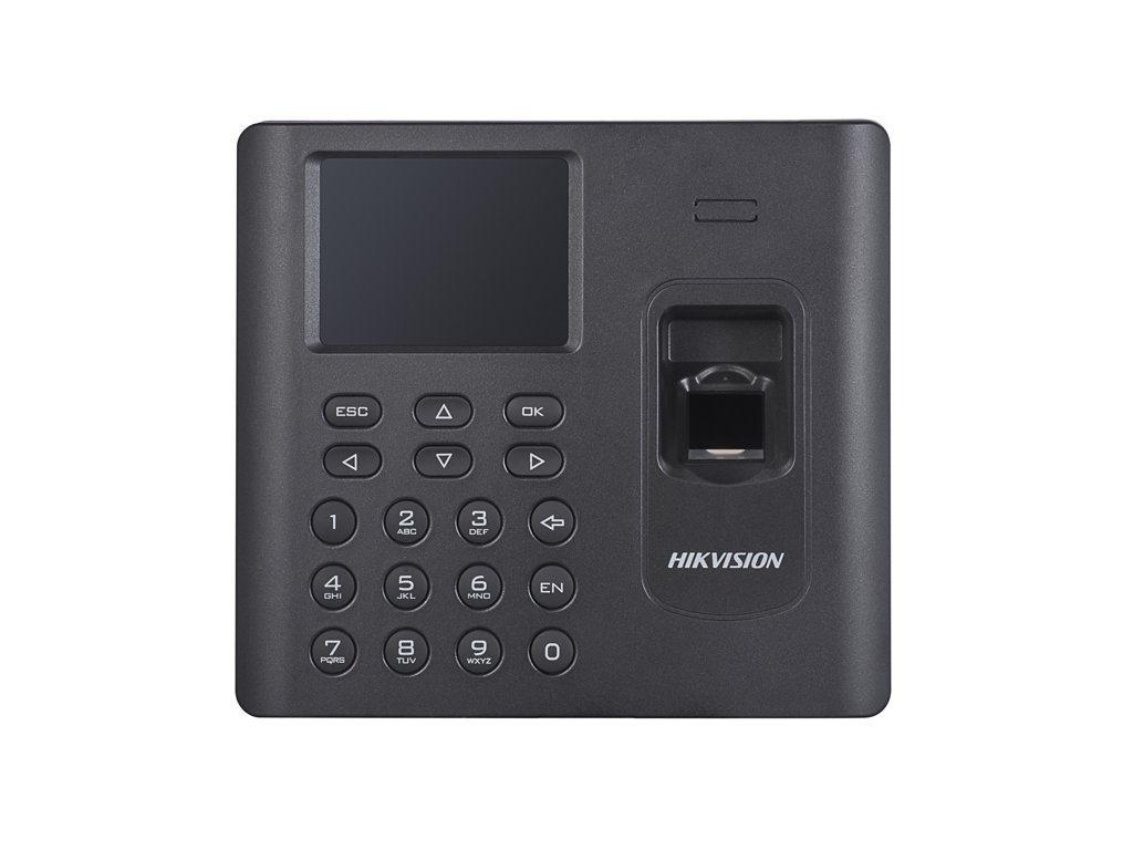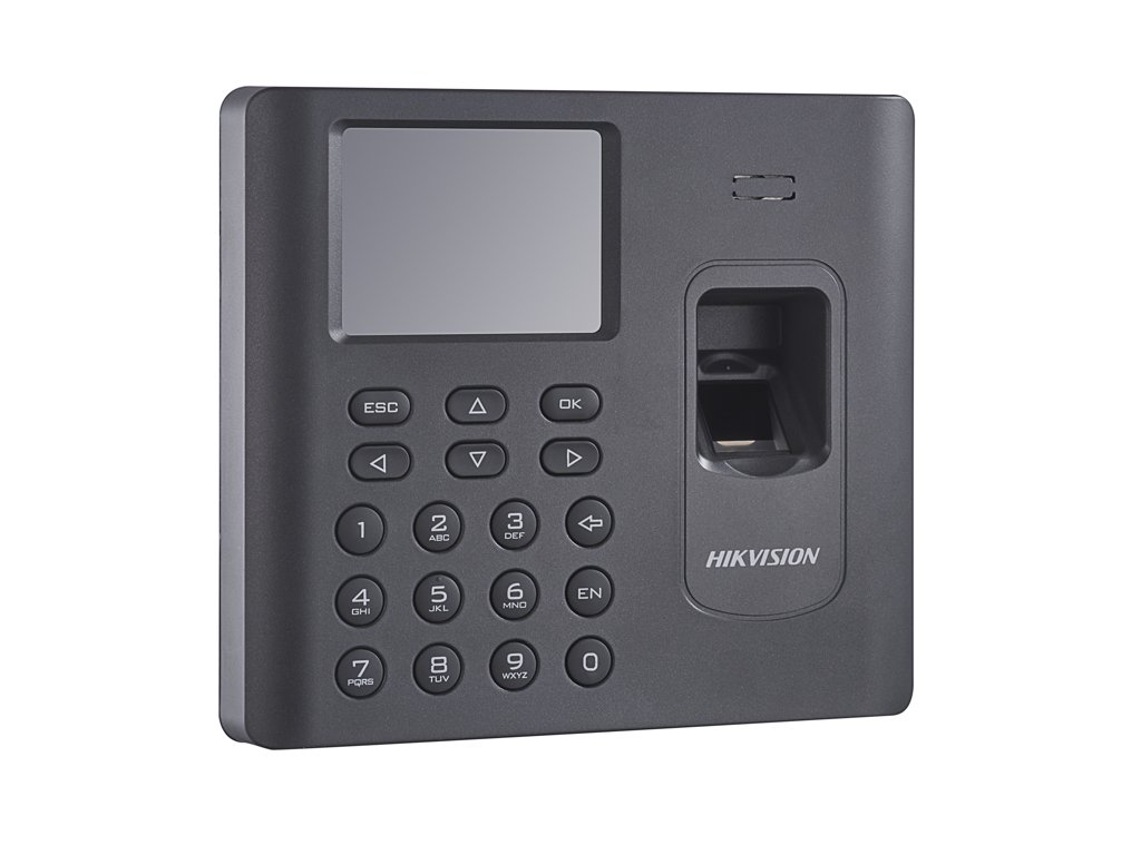 Záznamník času a docházky DS-K1A802AEF-B je samostatná jednotka s klávesnicí, čtečkou RFID a čtečkou otisků prstů.
