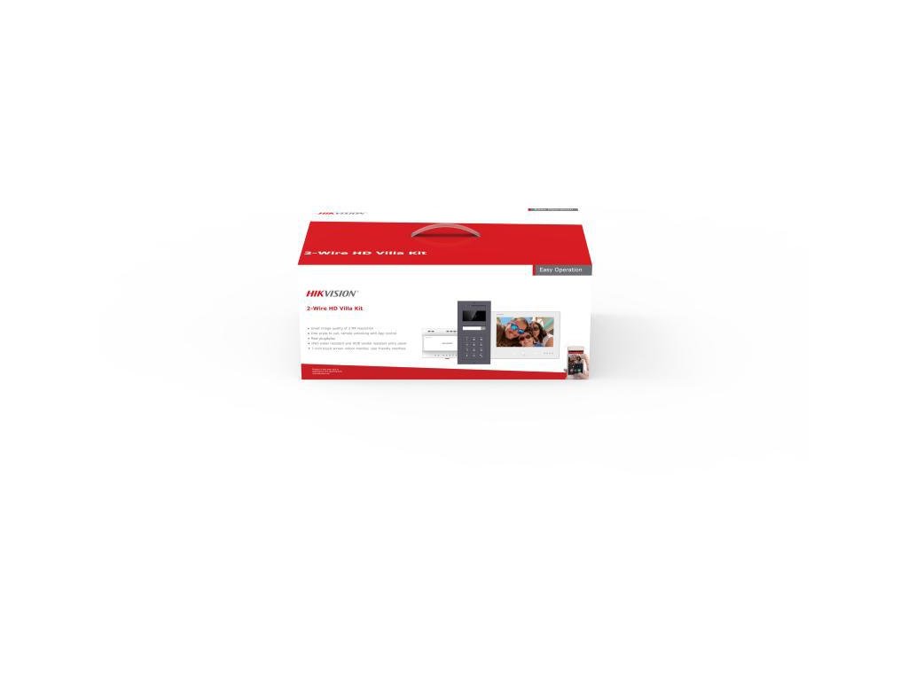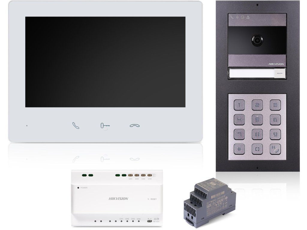 DS-KIS704EY je kompletní sada videotelefonu navržená pro práci v moderním, 2-drátovém IP systému generace Hikvision II – 2-wire HD (označené „EY“). Sada obsahuje: