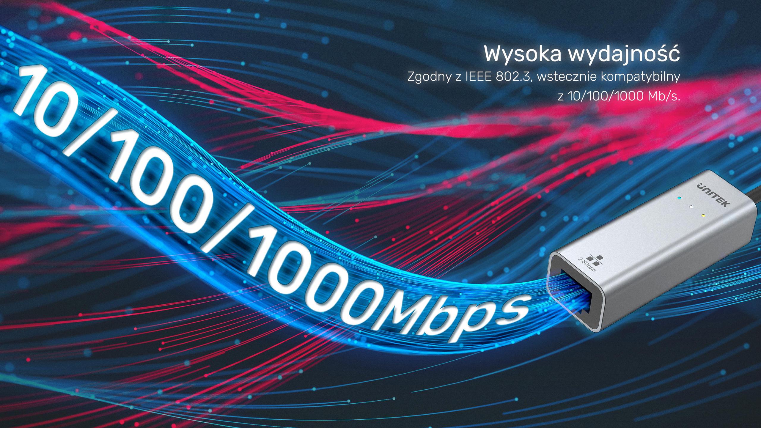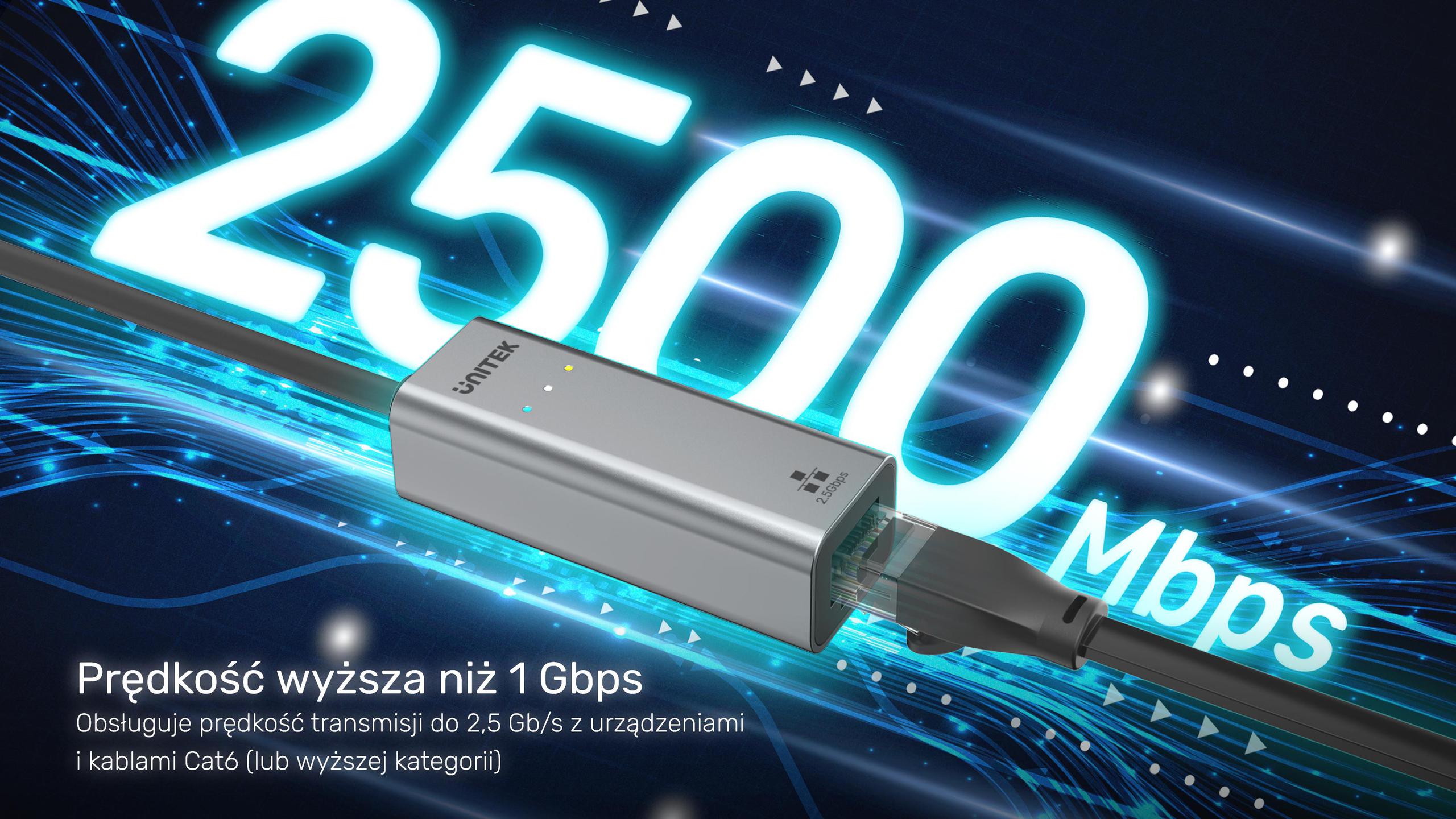 Adaptér Unitek U1313CGY01 nabízí propustnost sítě Ethernet až 2,5 Gb/s, což výrazně převyšuje standardní gigabitový Ethernet. Takový výkon umožňuje plynulé streamování, rychlé stahování a stabilní připojení i při velkém zatížení sítě.