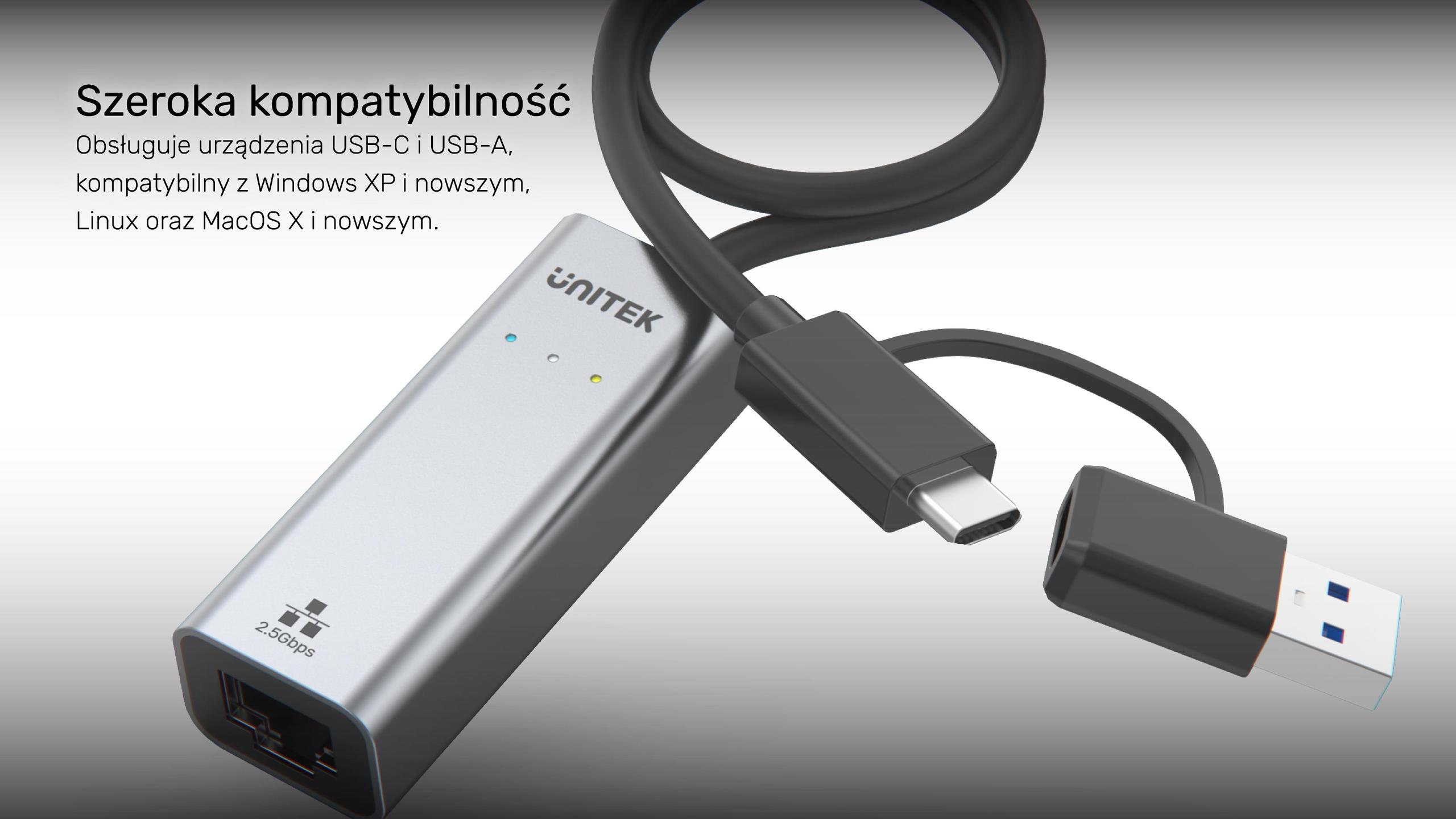 Unitek U1313CGY01 je adaptér určený pro uživatele, kteří očekávají stabilní, rychlé a spolehlivé síťové připojení. Díky hybridnímu konektoru USB-A/C a portu RJ-45 Ethernet s propustností až 2,5 Gb/s je zařízení ideální pro práci, streamování nebo přenos velkých souborů.