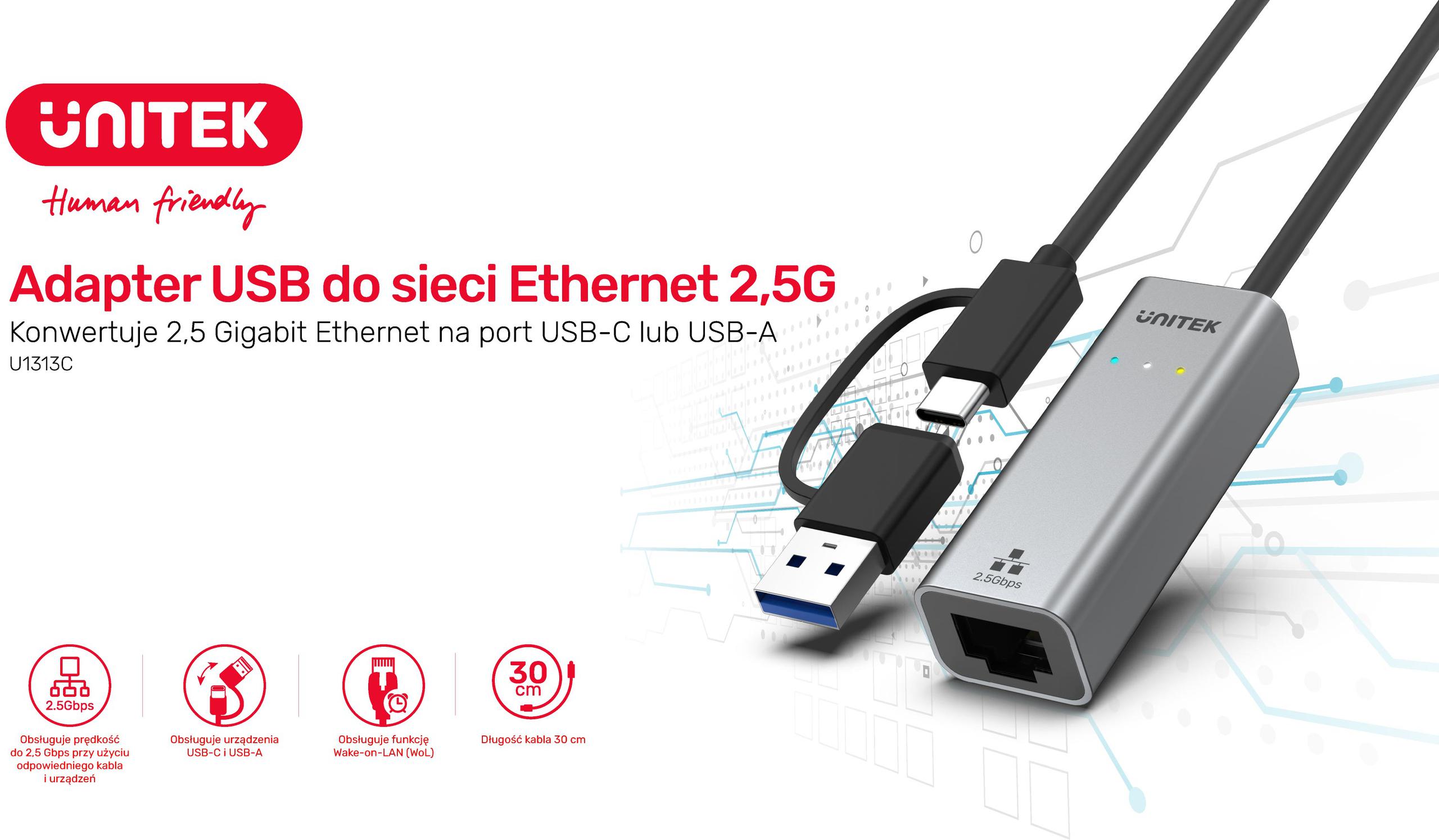 - Unitek U1313CGY01 přemění vaši zásuvku USB na konektor RJ-45 Ethernet, který poskytuje stabilní připojení k síti LAN a internetu.