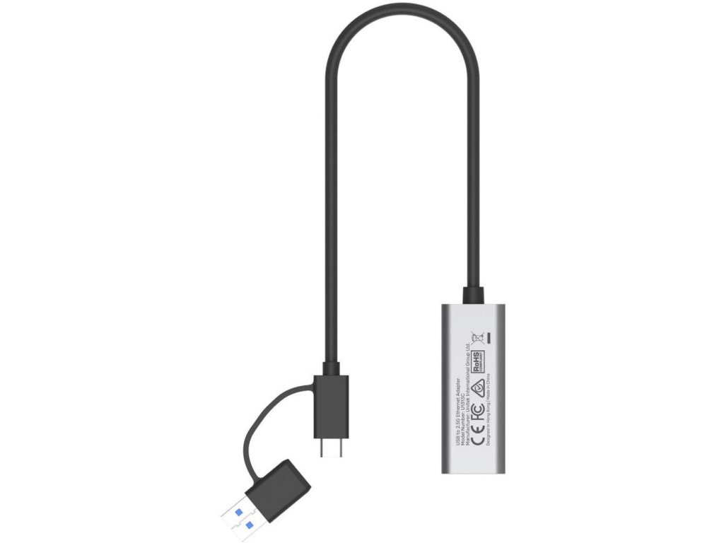 - Ethernetová zásuvka RJ-45 tohoto adaptéru podporuje přenos dat rychlostí až 2,5 Gb/s, zatímco zásuvky USB-A a USB-C podporují rychlost až 5 Gb/s.
