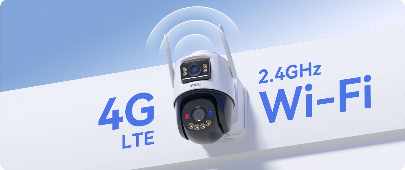 FotoaparátImou AOV Dual podporuje oběWi-Fi 2,4 GHza takésíť 4G LTE². Zařízeníautomaticky přepne mezi spojeními v případě ztráty signálu, aby monitorování fungovalonepřetržitě 24/7bez rizika odpojení.